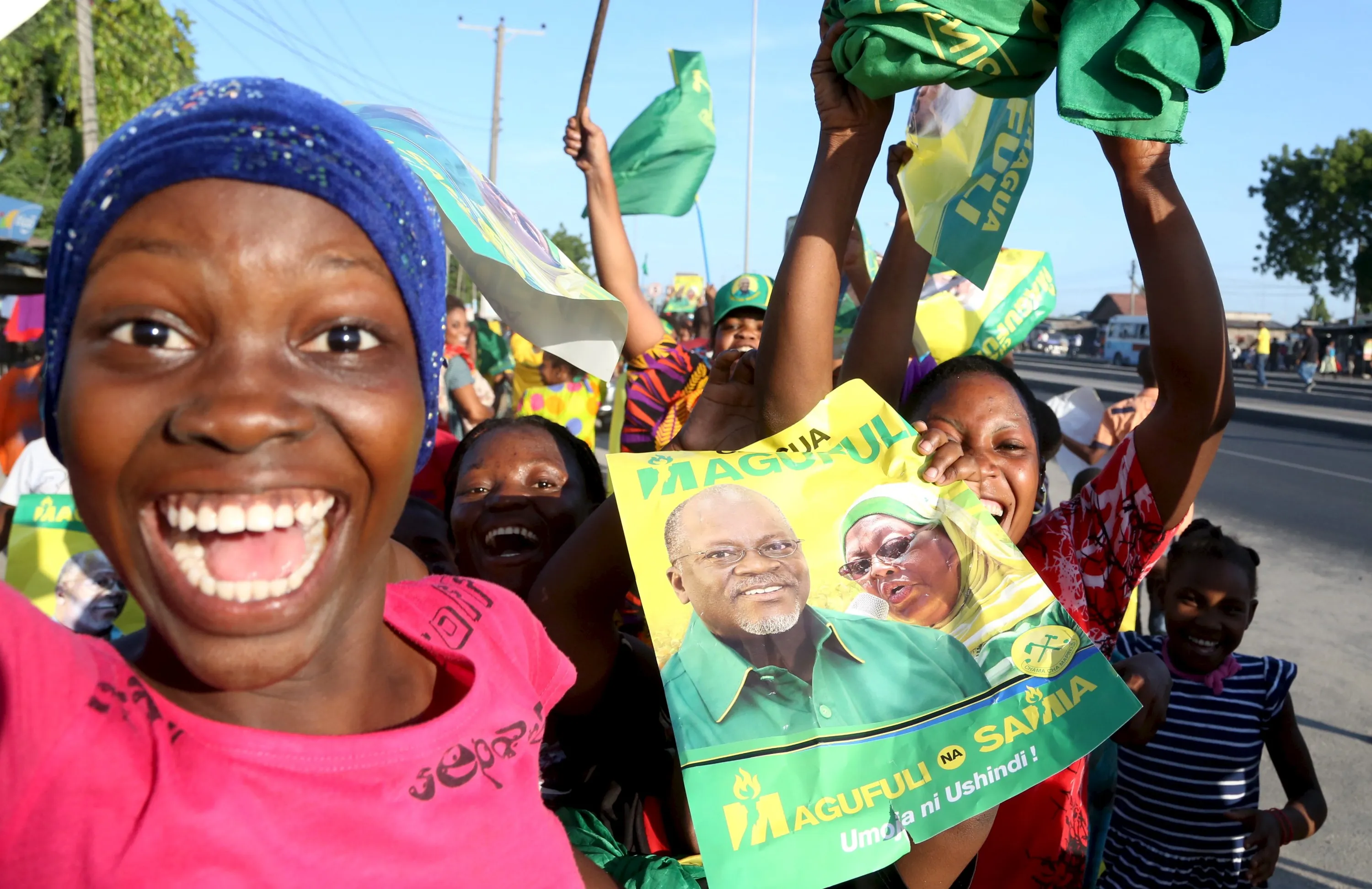 Supporters of Tanzania Presidential candidate of the ruling Chama Cha Mapinduzi (CCM) John Pombe Magufuli celebrate after he was declared the winner of the presidential election, in Dar es Salaam, October 29, 2015. Tanzania's ruling party candidate, John Magufuli, was declared winner on Thursday of a presidential election, after the national electoral body dismissed opposition complaints about the process and a demand for a recount. The election has been the most hotly contested race in the more than half a century of rule by the Chama Cha Mapinduzi Party, which fielded Magufuli, 56, a minister for public works. (Photo by Emmanuel Herman/Reuters)