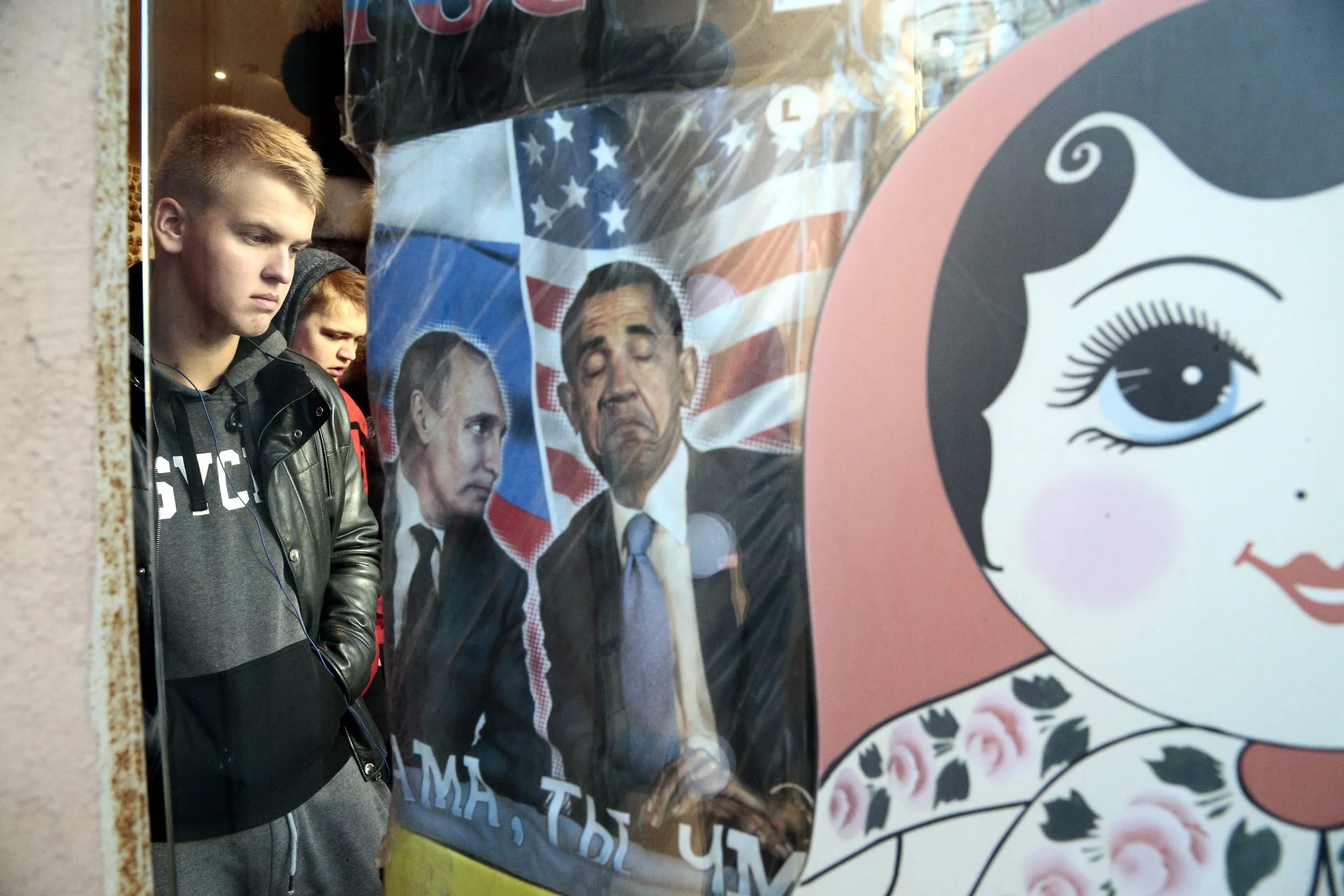 T-shirts printed with pictures of Russian President Vladimir Putin and US President Barack Obama are displayed on a rack at a souvenir shop in central Moscow, Russia, 29 October 2015. (Photo by Maxim Shipenkov/EPA)