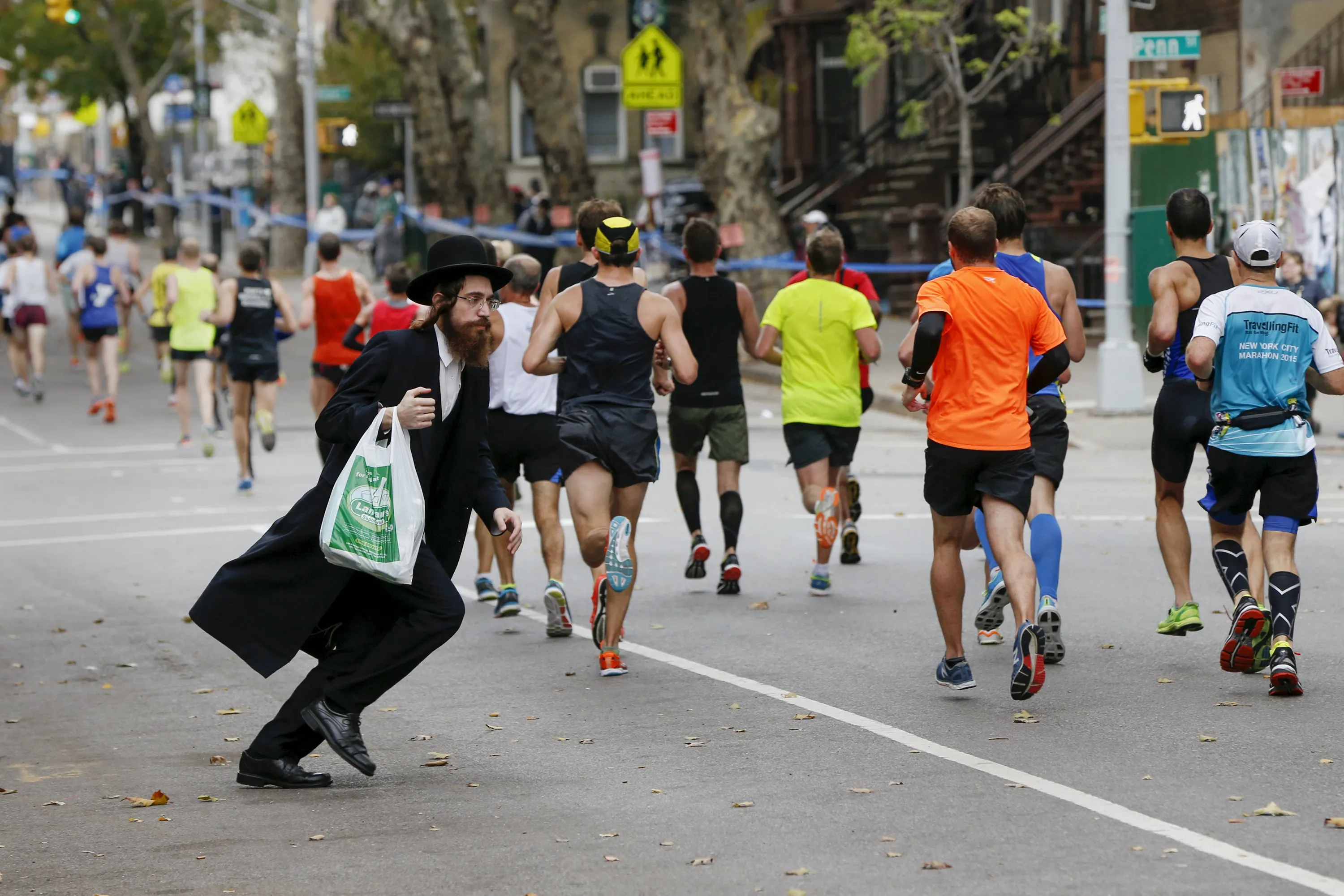 An Orthodox Jewish man tries to cross the street in the Williamsburg section of the Brooklyn borough during the 2015 New York City Marathon in New York, November 1, 2015. (Photo by Shannon Stapleton/Reuters)