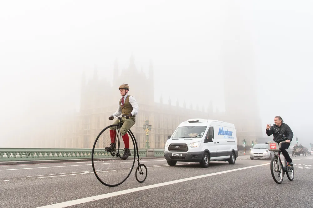 A man rides a Penny Farthing bicycle past the Houses of Parliament in Westminster shortly after beginning the 119th "Veteran Car Run" from Hyde Park in London, to Brighton in southern England, on November 1, 2015. Around 500 classic cars took part in the 60 mile journey to the south coast resort. (Photo by Leon Neal/AFP Photo)