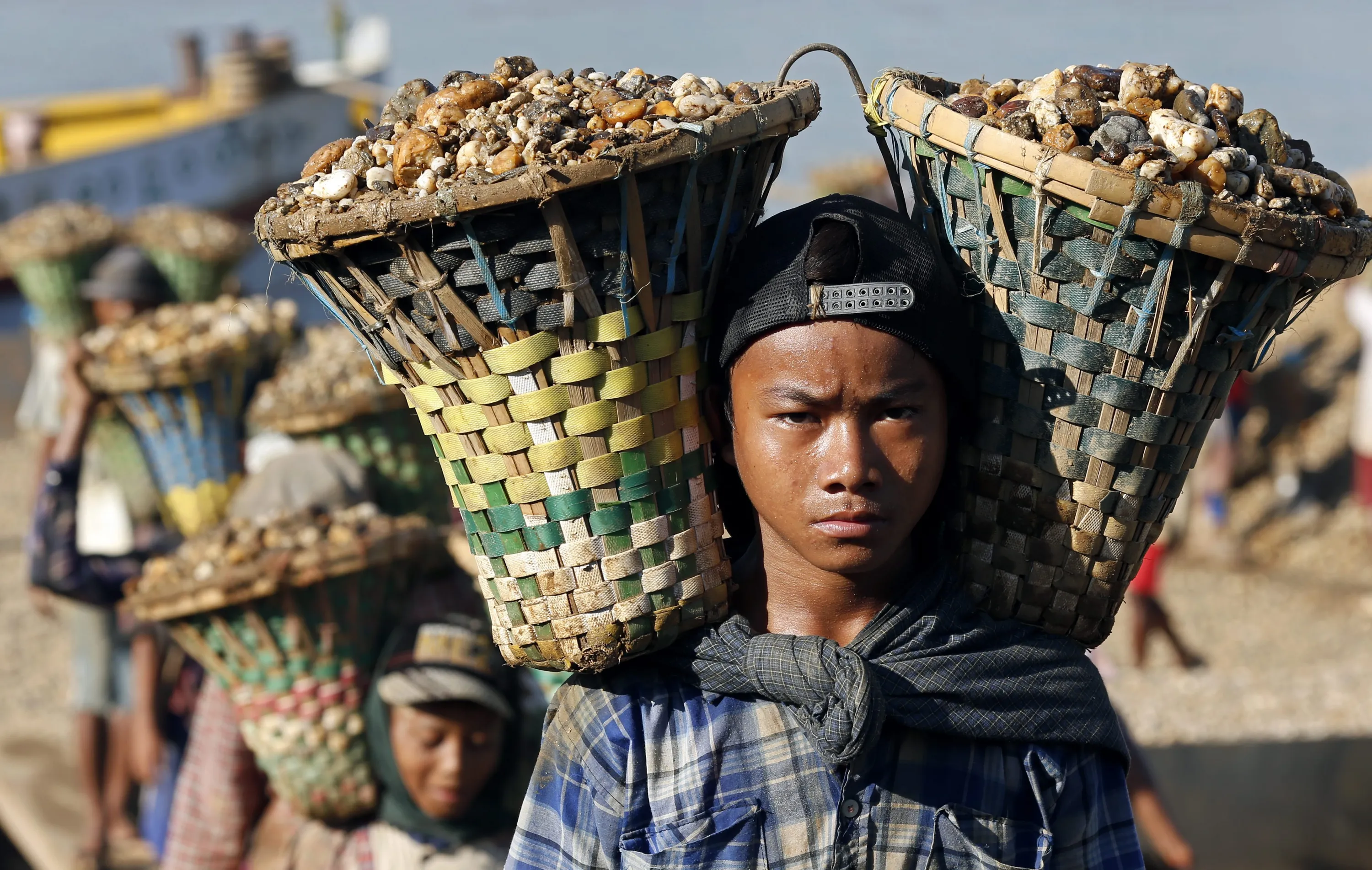 A Myanmar child laborer carries baskets loaded with gravel used for construction on his shoulders in Yangon, Myanmar, 06 November 2015. The new minimum wage of 3600 Kyats (2.80 dollars) for a standard eight-hour work day across all sectors and industries took effect in September. (Photo by Rungroj Yongrit/EPA)