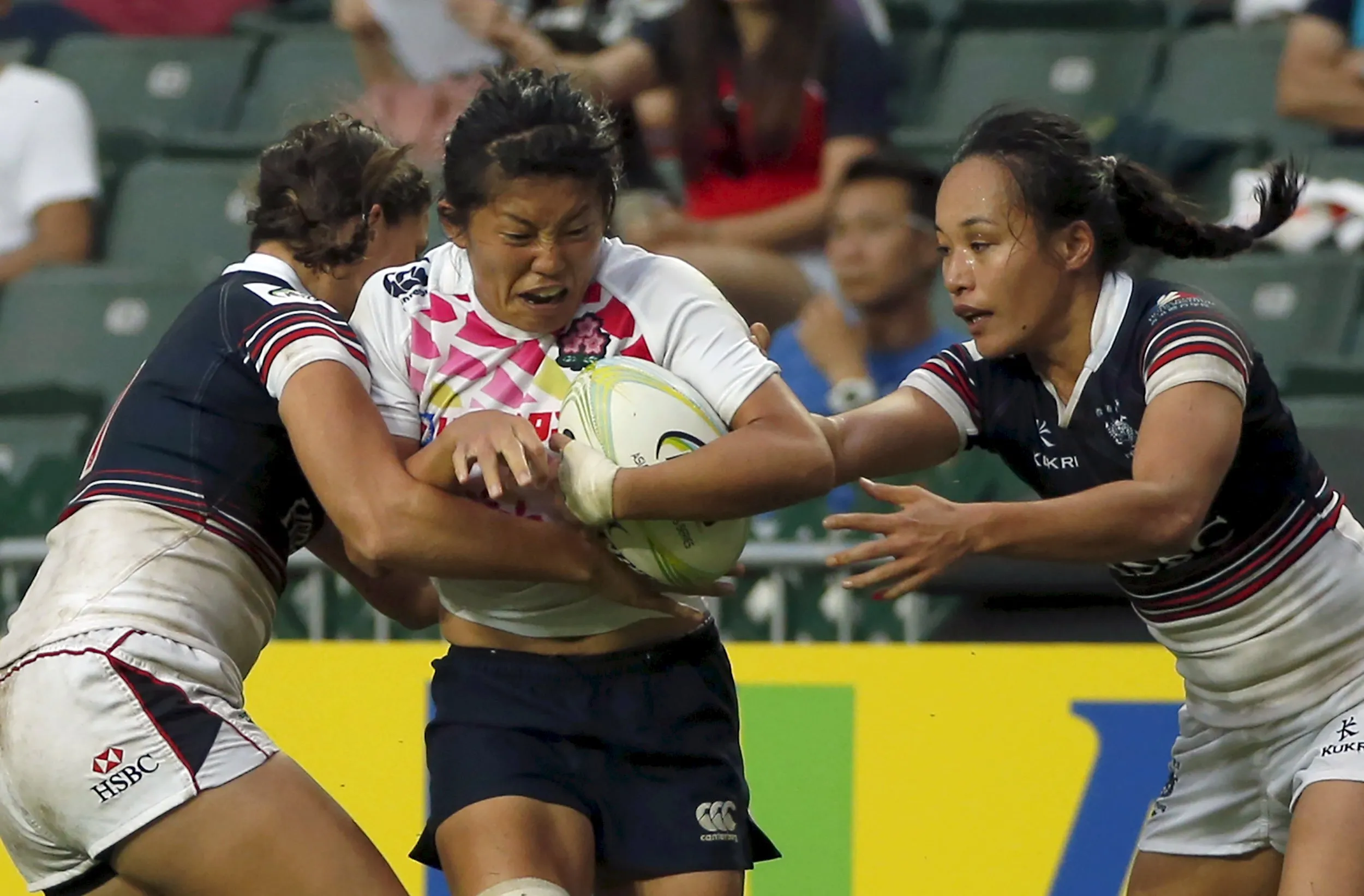 Japan's Takeuchi Aya (C) is tackled by Hong Kong's Christy Cheng Ka Chi (R) during their Asia rugby's sevens women qualifying tournament for the 2016 Rio Olympics, in Hong Kong, China November 7, 2015. (Photo by Tyrone Siu/Reuters)