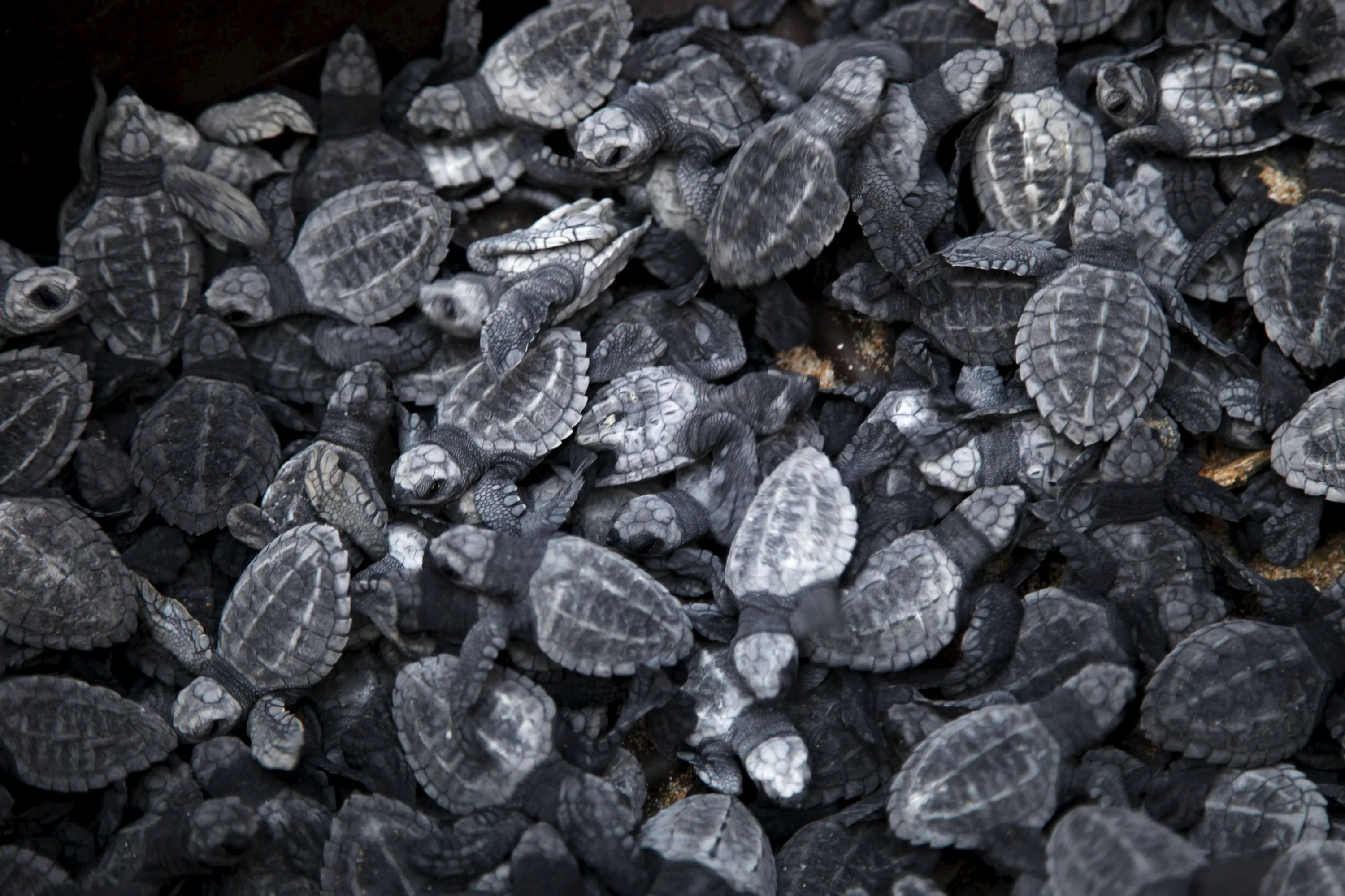 Olive Ridley turtle hatchlings (Lepidochelys olivacea) are seen before being released to the ocean in Mazatlan, Mexico, November 7, 2015. The Mazatlan Aquarium on Saturday released 300 hatchlings into the Pacific as part of a program to protect and recover the endangered specie. Millions of baby turtles hatch on the shores in November and December, according to environmental groups. (Photo by Reuters/Stringer)