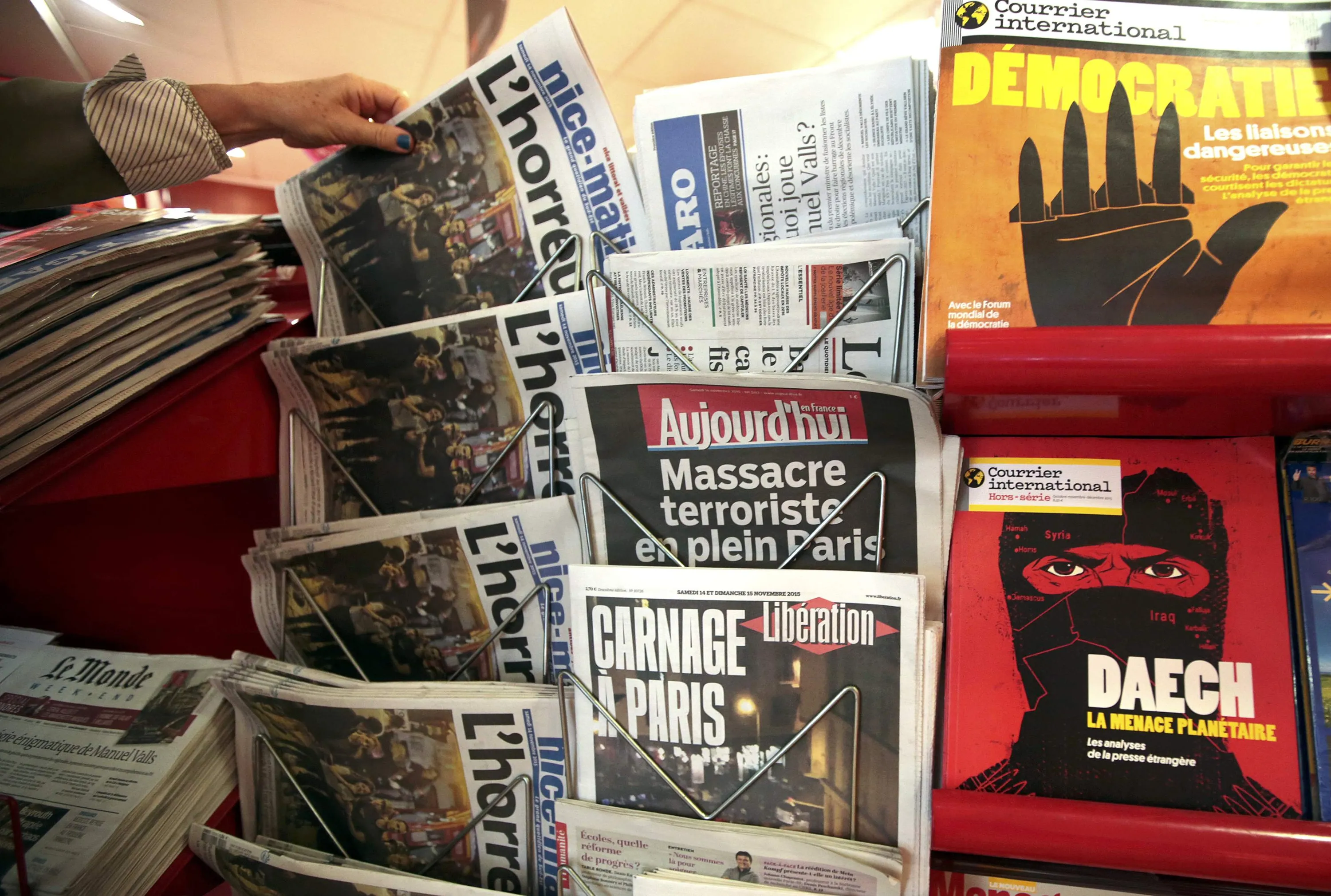 A woman takes the local newspaper at a news stand which displays a magazine (R bottom) which reads "Daech, the planetary threat" in NIce, France, November 14, 2015, the day after fatal shootings in the French capital. (Photo by Eric Gaillard/Reuters)