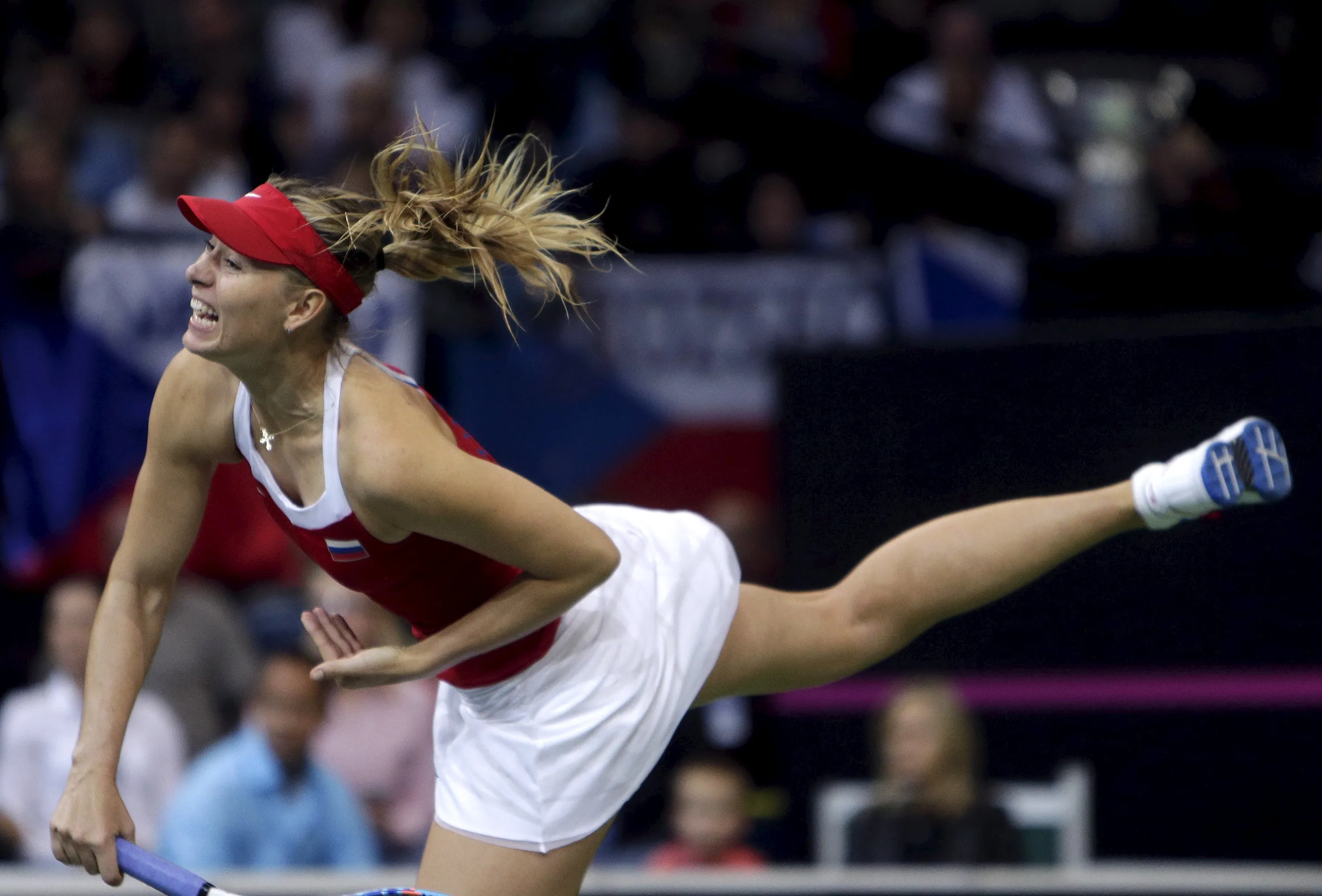 Russia's Maria Sharapova serves to Czech Republic's Petra Kvitova during their final match of the Fed Cup tennis tournament in Prague, Czech Republic, November 15, 2015. (Photo by David W. Cerny/Reuters)