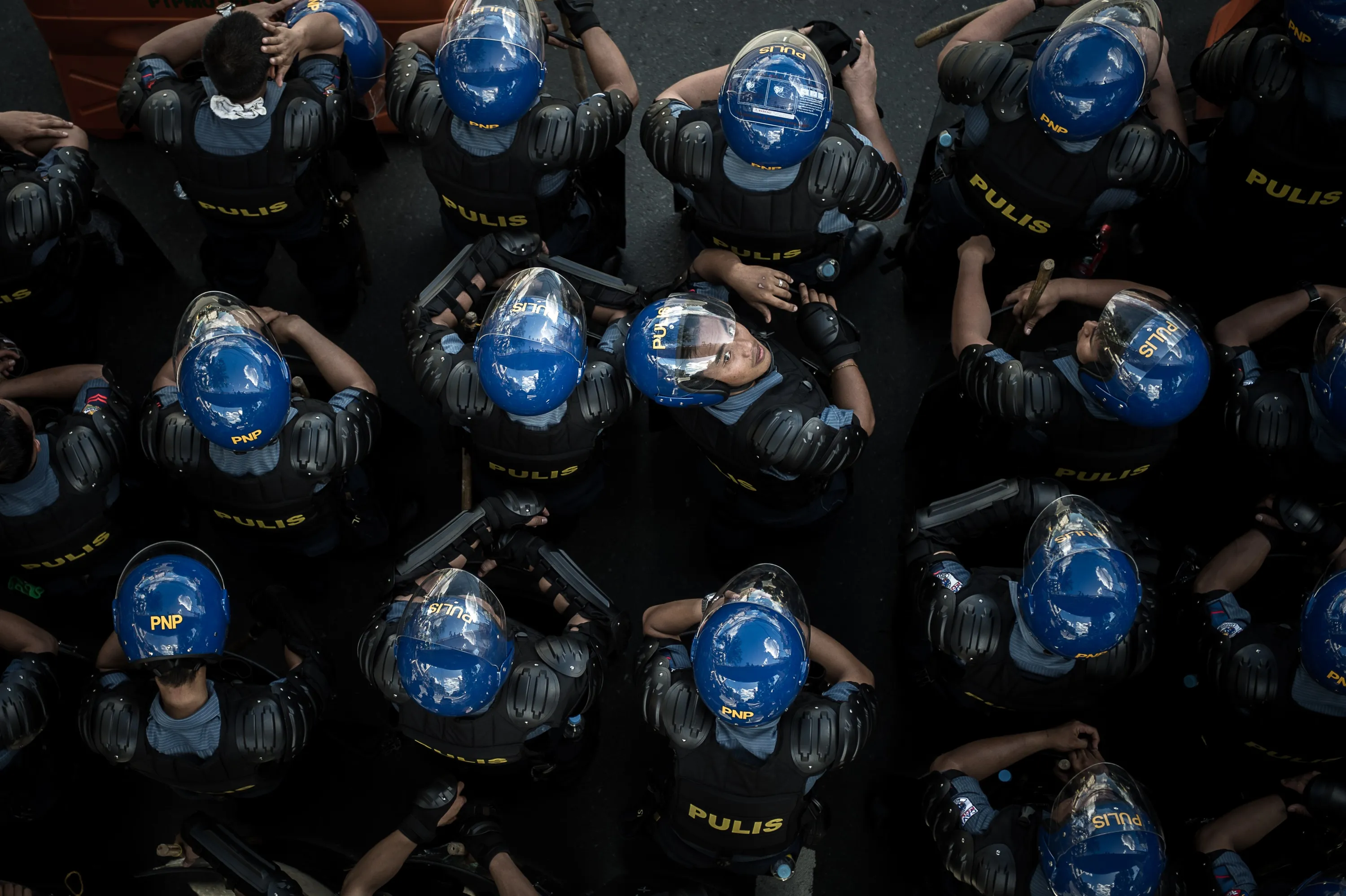 A Philippine policeman looks up as they keep vigil after protesters staged a demonstration in opposition to the Asia-Pacific Economic Cooperation (APEC) Summit currently in Manila on November 19, 2015. Police pumped out Katy Perry pop songs on loudspeakers and fired water cannons to disperse protesters at the Asia-Pacific leaders summit, with bewildered demonstrators denouncing the music tactics as "ridiculous". (Photo by Philippe Lopez/AFP Photo)