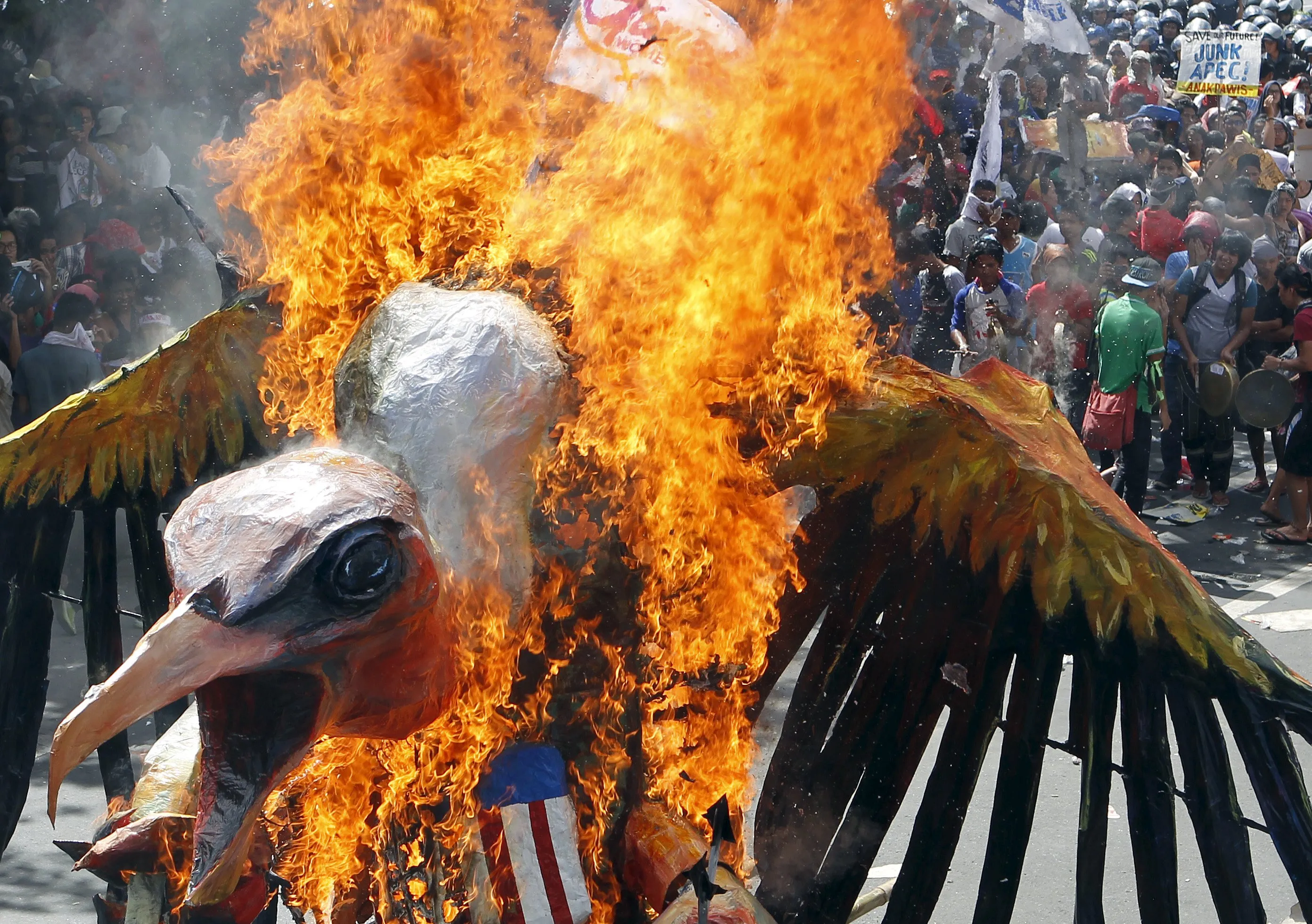 Protesters burn an effigy during a rally near the venue of the Asia-Pacific Economic Cooperation (APEC) summit, in Manila November 19, 2015. (Photo by Cheryl Gagalac/Reuters)