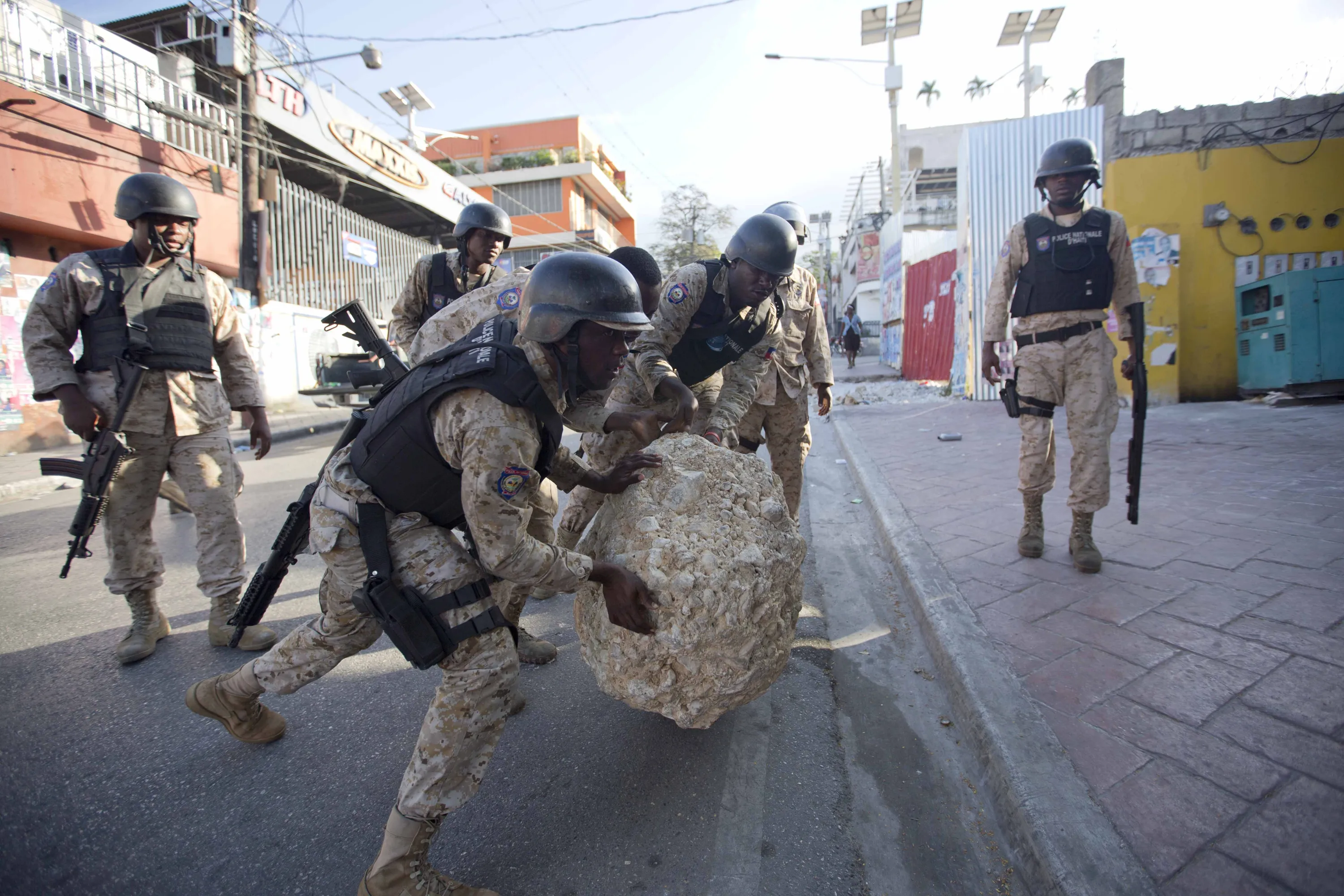 National police officers remove a rock used as a street barricade by demonstrators, after a protest against the results of Oct. 25 elections, in Port-au-Prince, Haiti, Wednesday, November 18, 2015. The demonstrators are claiming fraud in the recent first round of elections. The demonstrators are organized by three political parties who have joined to demand the cancellation of the Oct. 25 presidential election, or removal of ruling party candidate Jovenel Moise who is set to face Jude Celestin in a Dec. 27 presidential runoff election. (Photo by Dieu Nalio Chery/AP Photo)