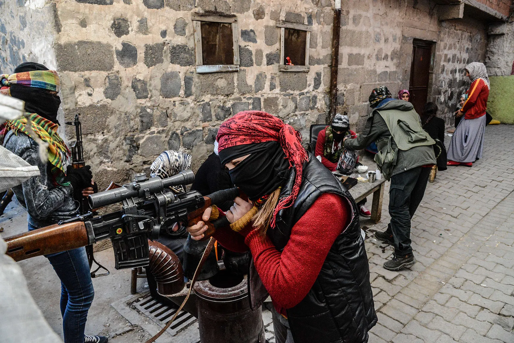 Armed Kurdish women millitants, man a barricade, on November 18, 2015 in the Sur district of Diyarbakir. Tensions rose when pro-Kurdish MP Leyla Zana began her oath with "Biji Asiti", or "Long live peace" in Kurdish. The phrase triggered a storm that recalled her memorable swearing-in 24 years ago when she also spoke the language that was then still taboo in public. (Photo by Ilyas Akengin/AFP Photo)