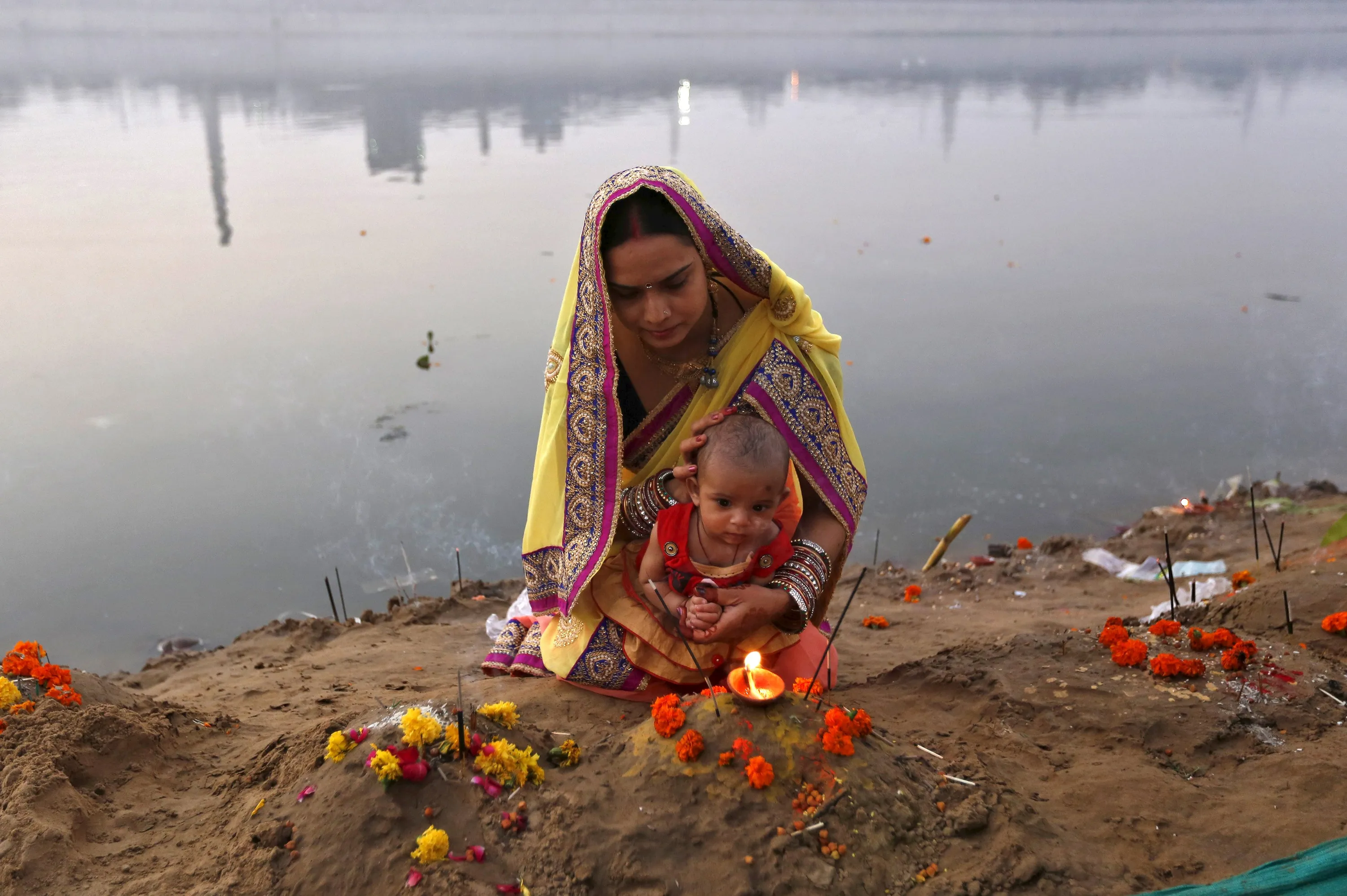 A Hindu woman and her child worship on the banks of river Sabarmati after offering prayers to the Sun god Surya during the Hindu religious festival of Chatt Puja in Ahmedabad, India, November 17, 2015. (Photo by Amit Dave/Reuters)