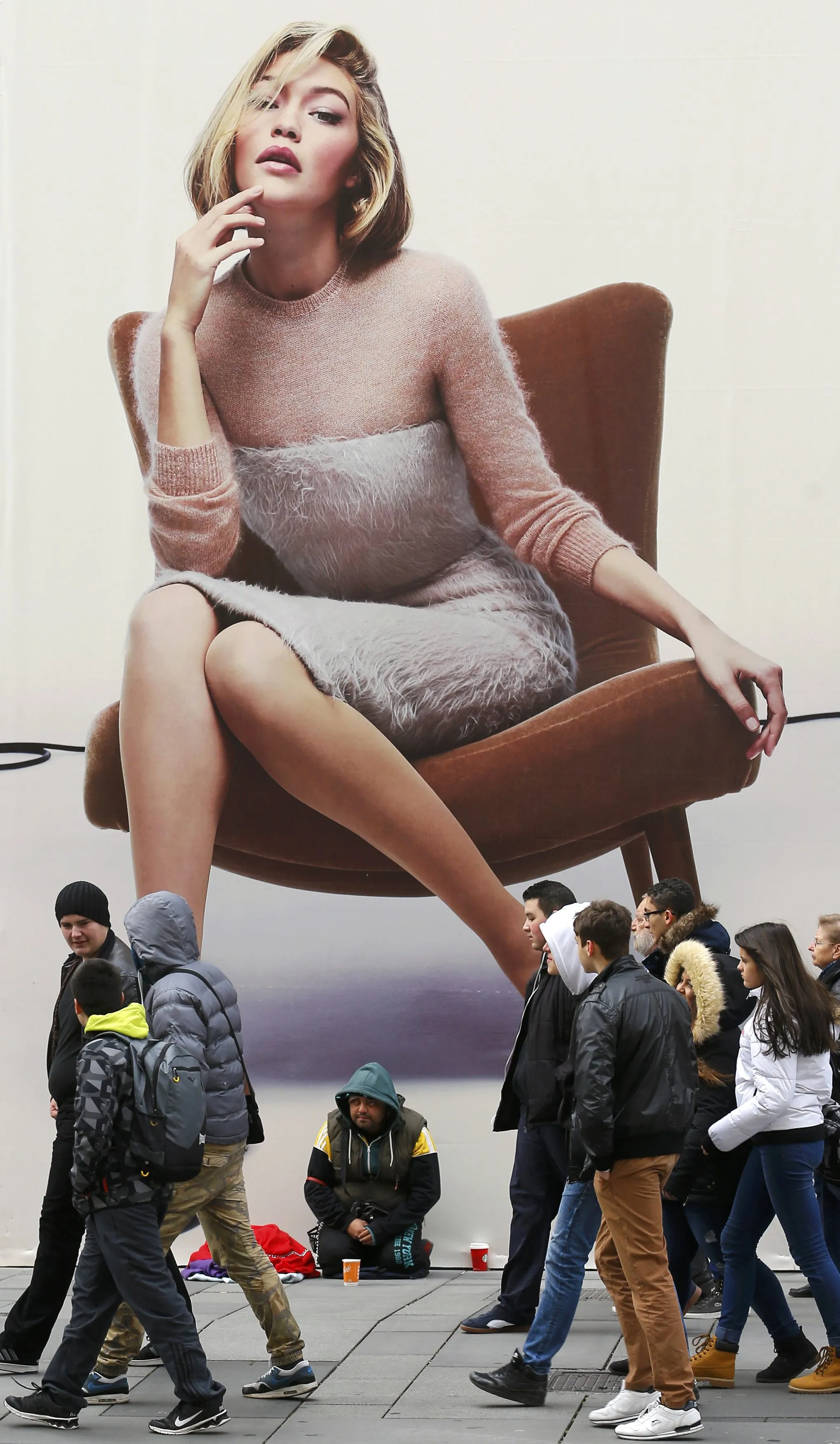 A beggar kneels in front of an advertising billboard in the centre of Vienna, Austria, November 25, 2015. (Photo by Heinz-Peter Bader/Reuters)