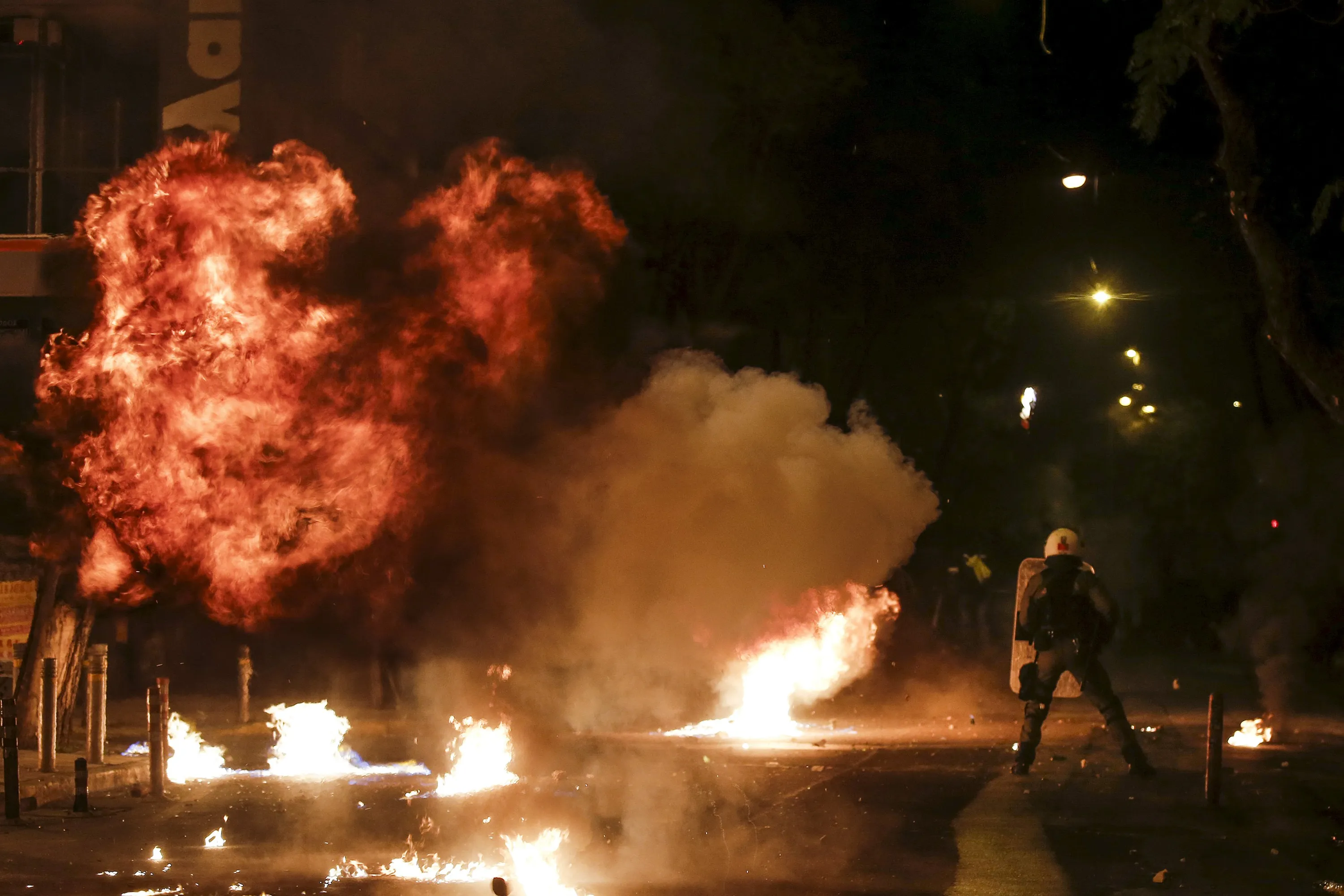A petrol bomb explodes next to a riot police officer during clashes with hooded youth following an anniversary rally marking the 2008 police shooting of 15-year-old student, Alexandros Grigoropoulos, in Athens, Greece, December 6, 2015. (Photo by Alkis Konstantinidis/Reuters)