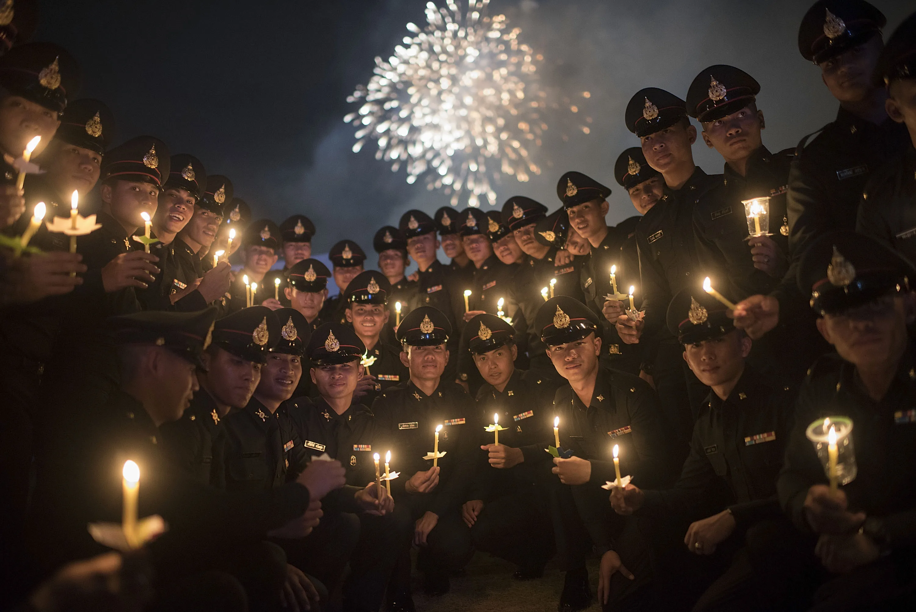 Thai policemen pose for a picture during a massive candle light ceremony for King's birthday at Sanam Luang on December 5, 2015 in Bangkok, Thailand. The world's longest-reigning monarch, King Bhumibol Adulyadej's health is closely watched as he is kept in hospital now and hasn't been publicly seen in weeks. The Thai King has been considered the most unifying symbol for a country that has seen increased political divisions and violence. (Photo by Borja Sanchez-Trillo/Getty Images)