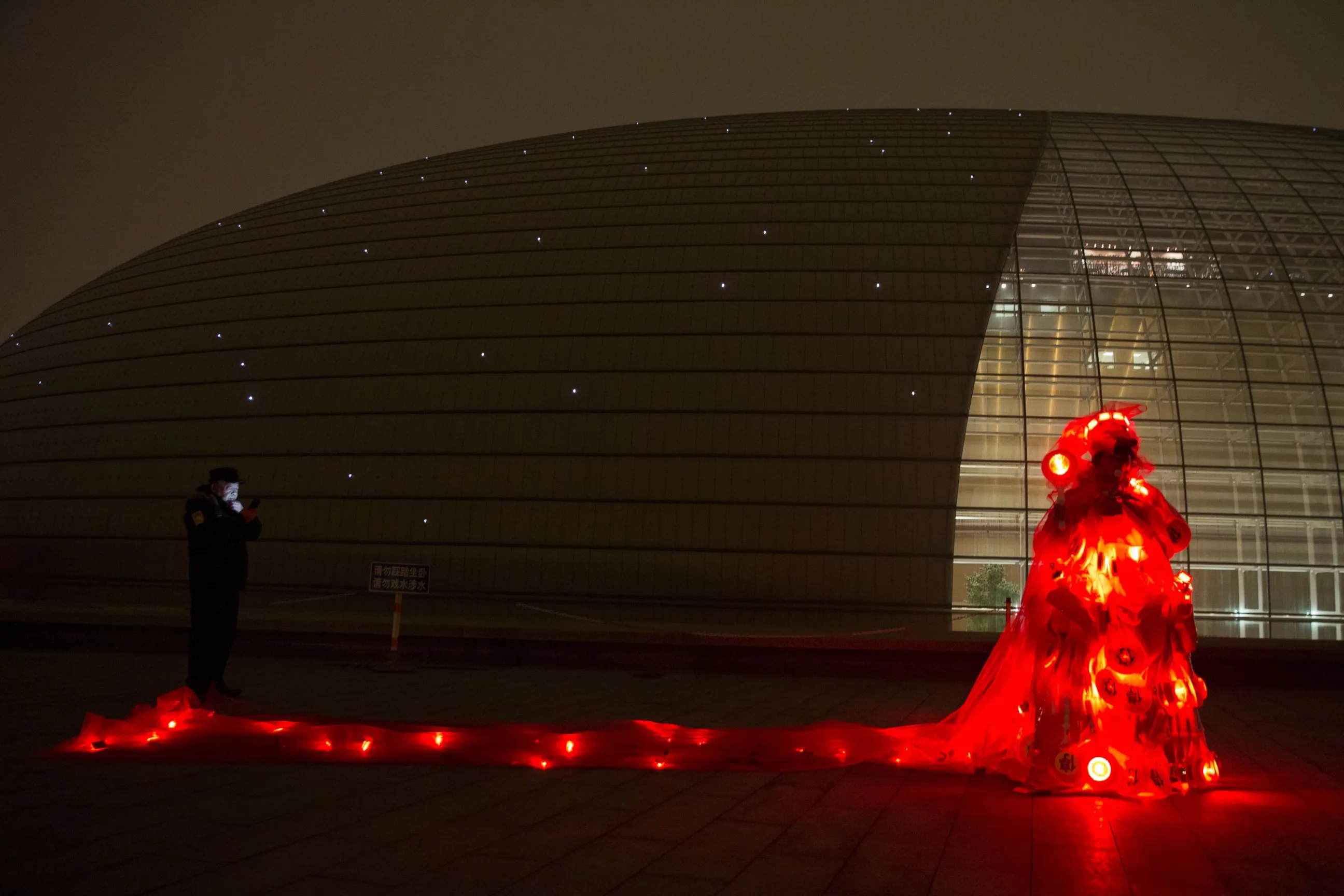 Performance artist Kong Ning wears a gown with glowing red light and stop signs to raise awareness of the smog enveloping Beijing, December 9, 2015. (Photo by Ng Han Guan/AP Photo)