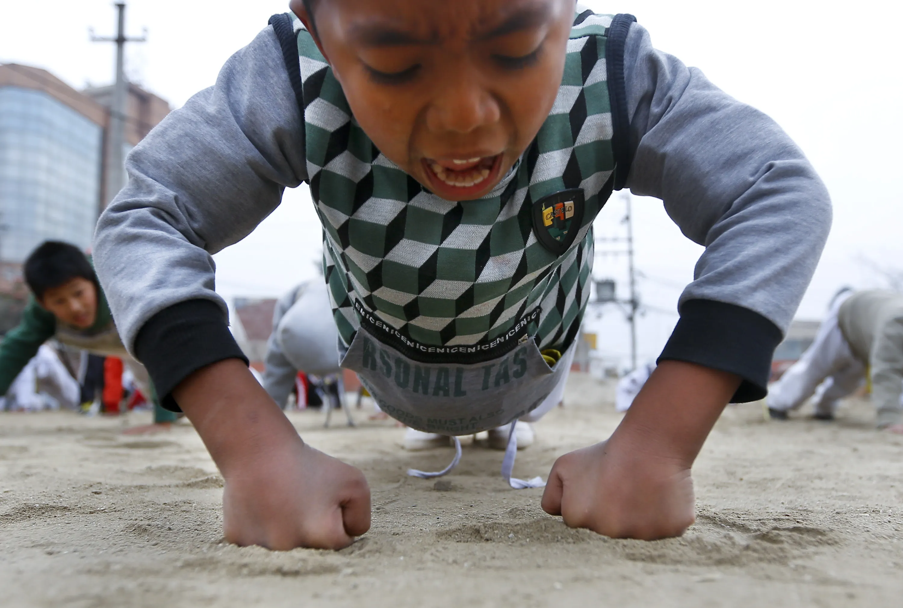 Nepalese children practice Takenwondo and Karate as they attend a self-defense training class during early morning in Kathmandu, Nepal, 15 December 2015. The Lainchour Takenwondo Dojang organizes classes for more than 70 children aged between seven and 18-year-old at a community ground in Kathmandu. Students attend everyday three-hour-long classes which they have to pay 400 Nepalese rupee (four US dollar) per month. Most of the students say that they come to the Takenwondo class for physical fitness and self-defense. (Photo by Narendra Shrestha/EPA)