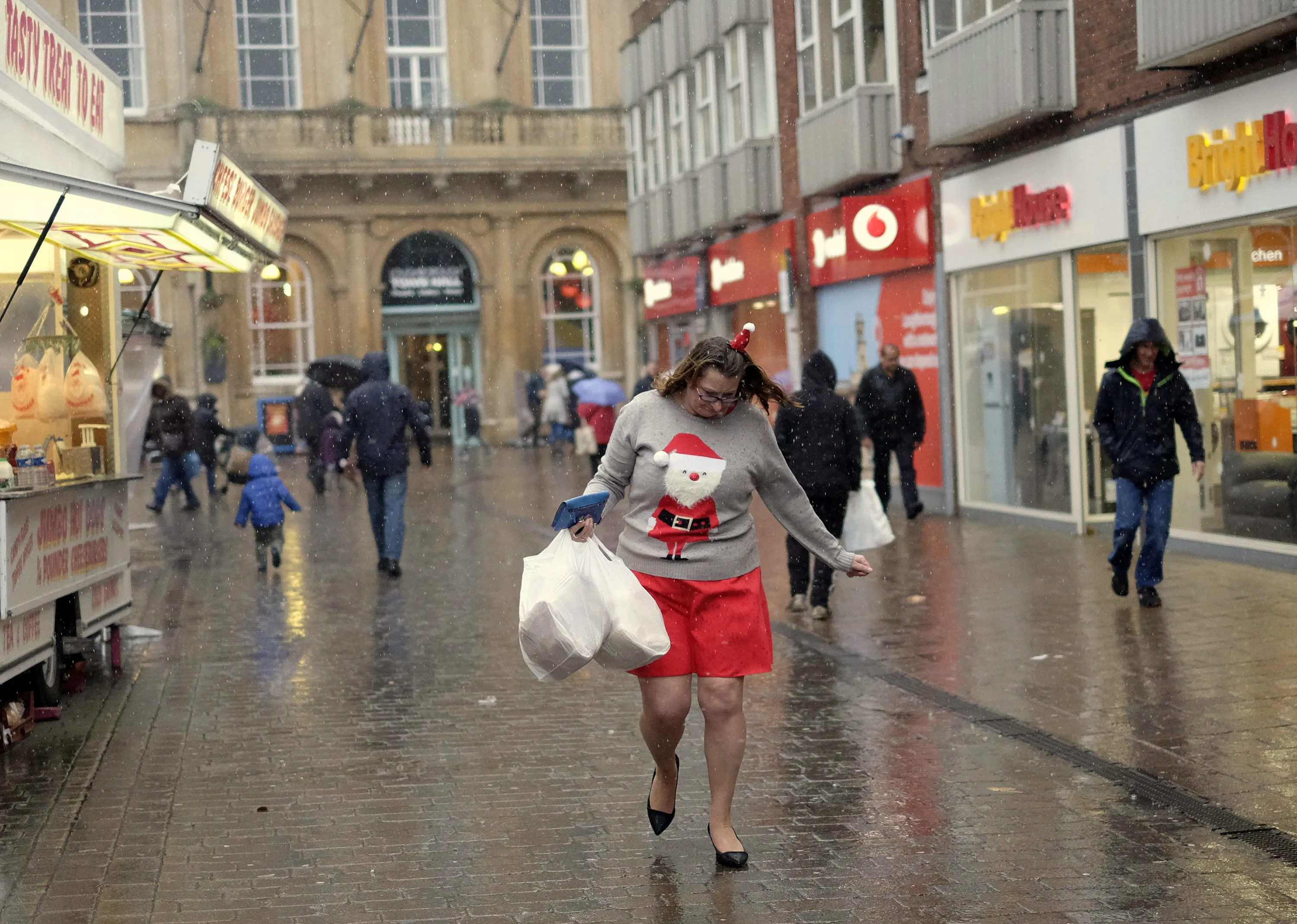 A woman walks with shopping during rainfall on Christmas Eve in Loughborough, Britain December 24, 2015. (Photo by Darren Staples/Reuters)