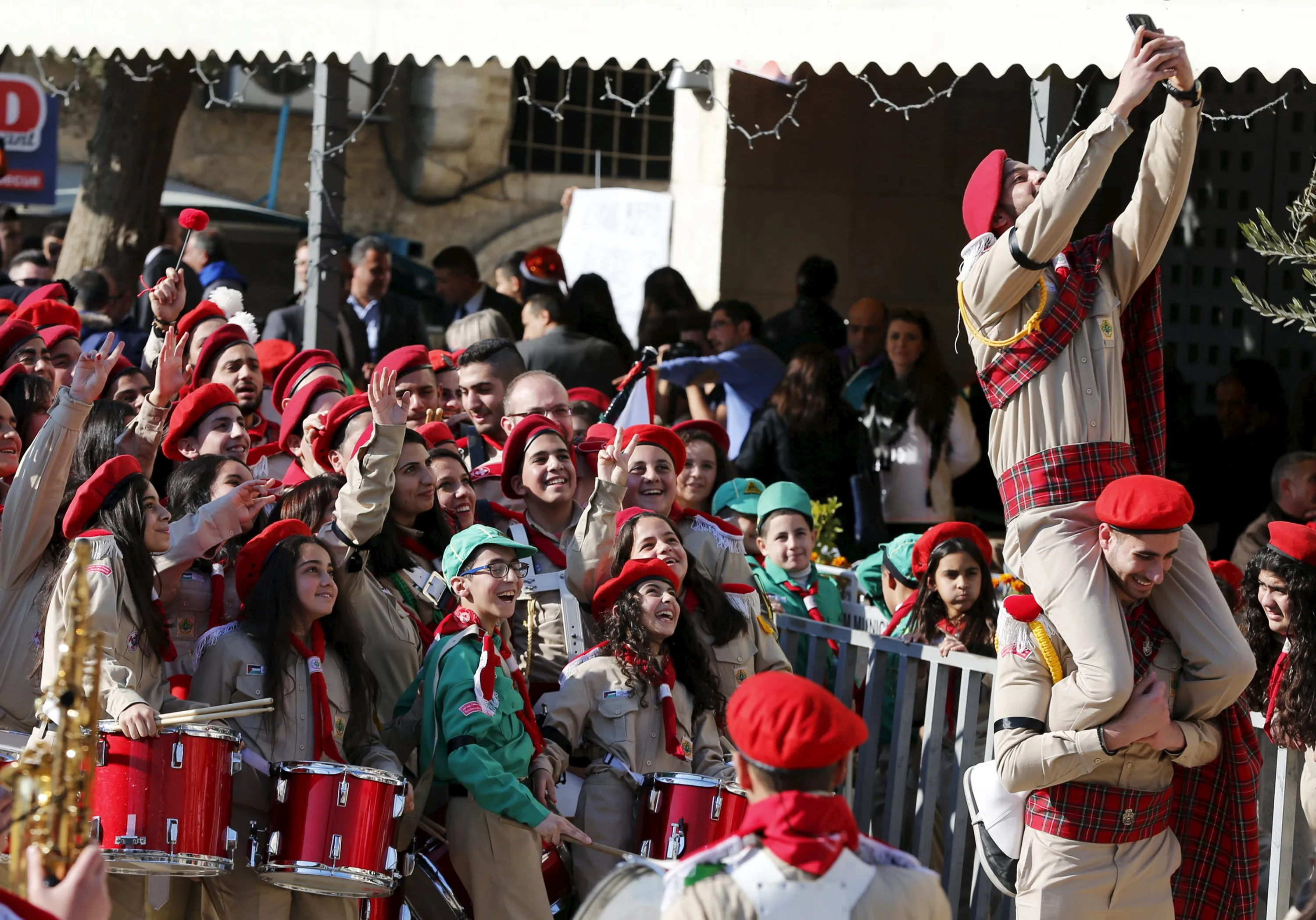 A member of a Palestinian marching band takes a selfie during celebrations at Manger Square in the West Bank town of Bethlehem, December 24, 2015. (Photo by Ammar Awad/Reuters)