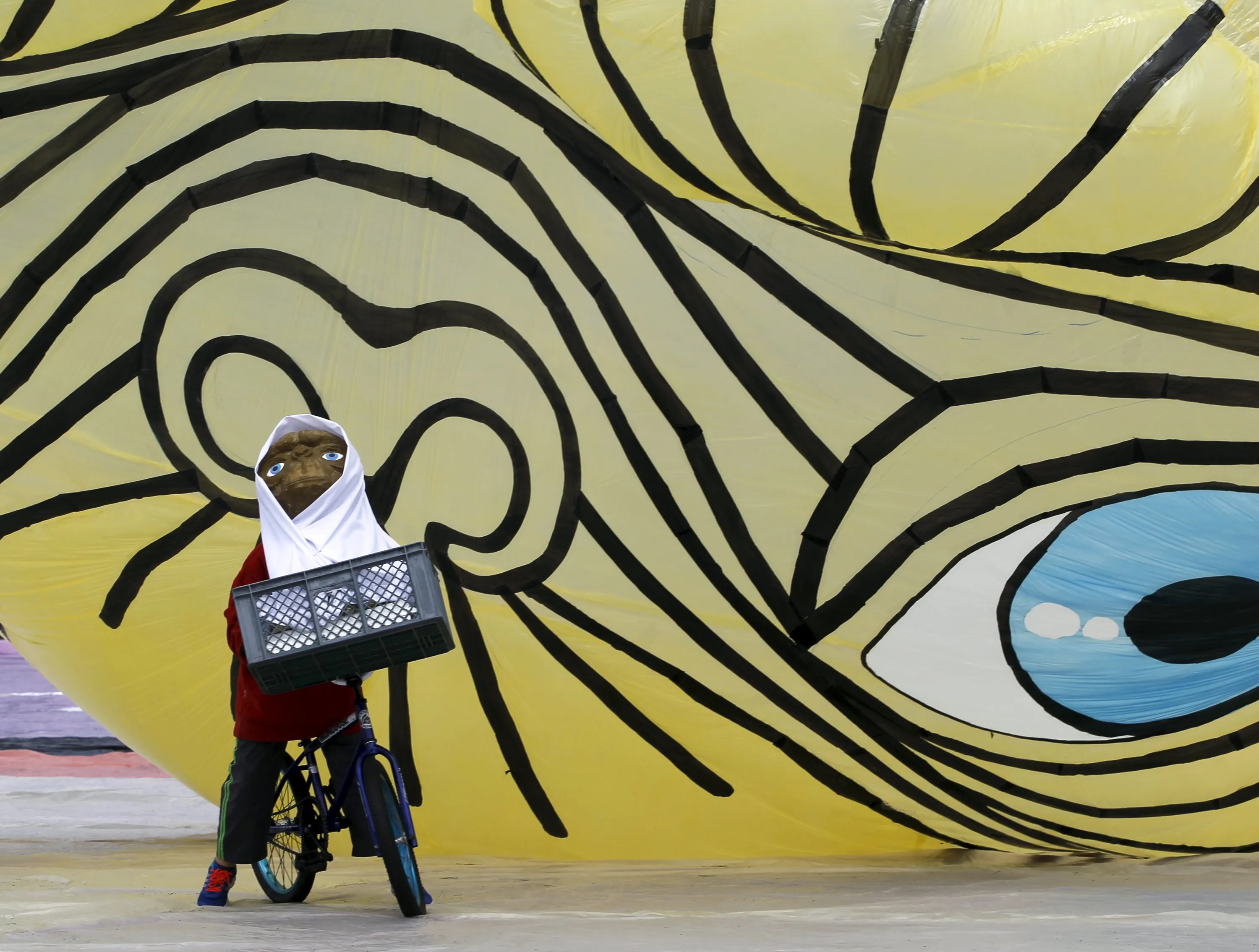 A boy riding a bicycle is seen in front of a balloon depicting the face of alien movie character E.T. at the 15th Solar Balloon Festival in Envigado, Colombia December 31, 2015. REUTERS/Fredy Builes EDITORIAL USE ONLY. NO RESALES. NO ARCHIVE