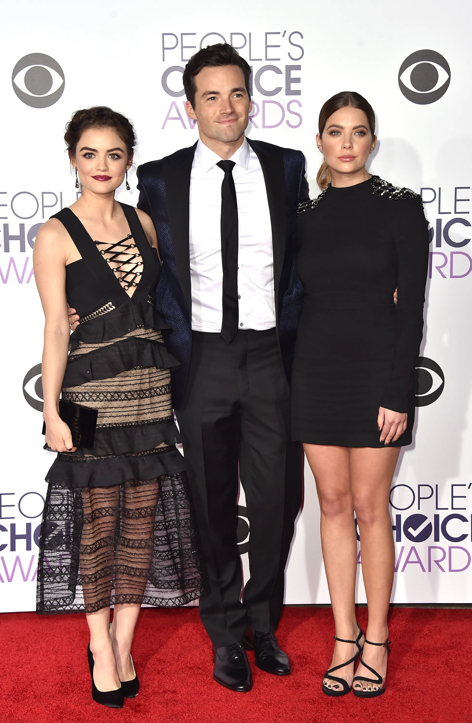 Lucy Hale, and from left, Ian Harding, and Ashley Benson arrive at the People's Choice Awards at the Microsoft Theater on Wednesday, January 6, 2016, in Los Angeles. (Photo by Jordan Strauss/Invision/AP Photo)