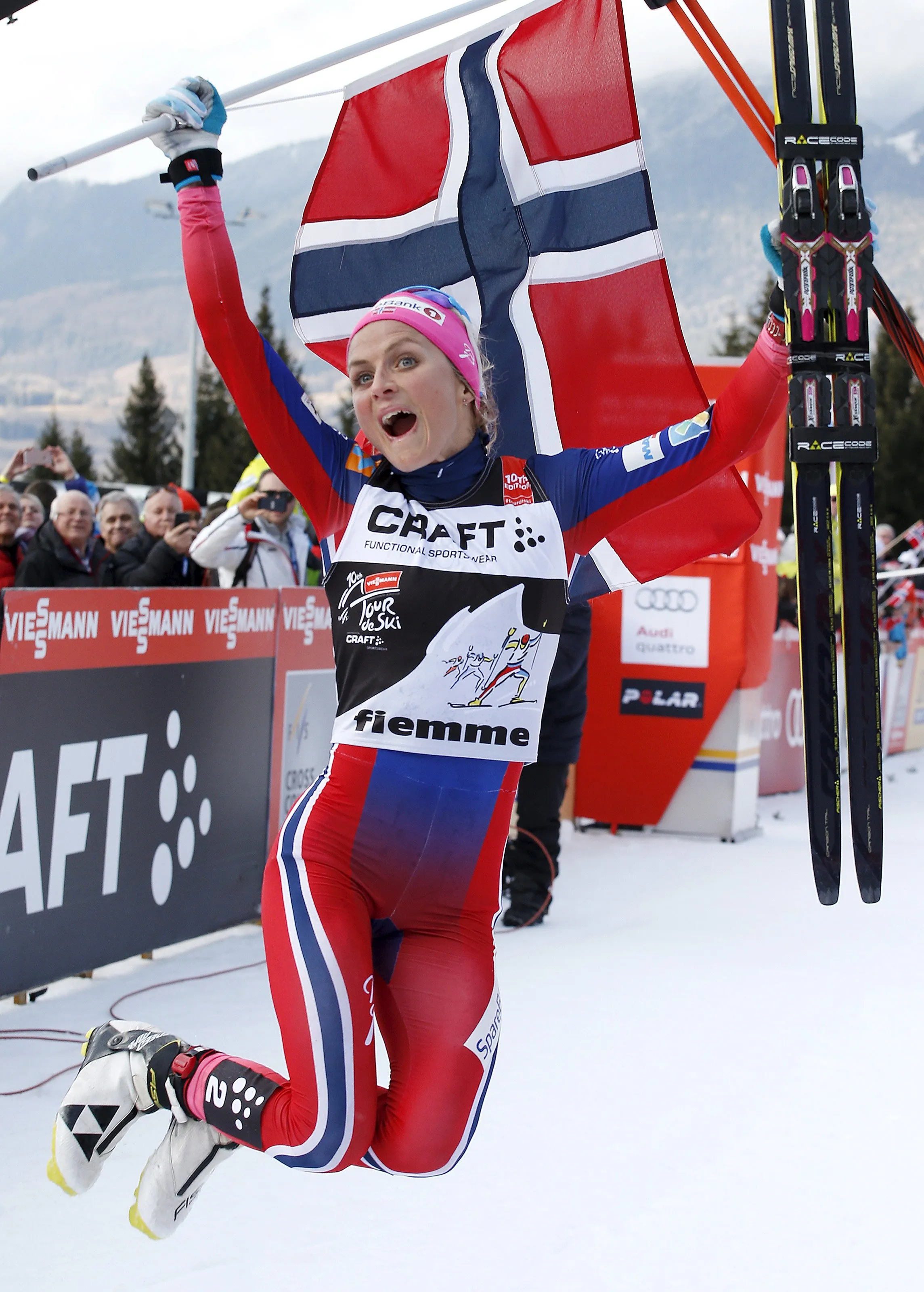FIS Tour de Ski overall women winner Therese Johaug of Norway celebrates, after the women's cross-country skiing 9km final climb free pursuit race on the Alpe Cermis, in Val di Fiemme January 10, 2016. (Photo by Alessandro Garofalo/Reuters)