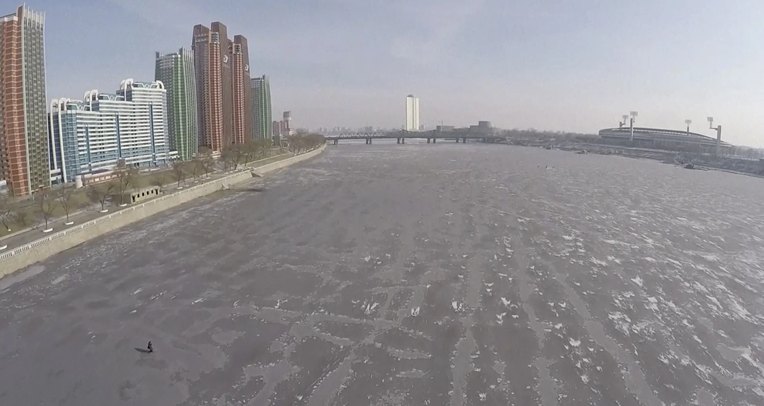 This image made from Associated Press Television News video shows an aerial view of the frozen Taedong River in Pyongyang, North Korea, on Wednesday, January 20, 2015. The depths of winter have hit North Korea, with temperatures dropping lower than last year. (Photo by Associated Press Television News via AP Photo)