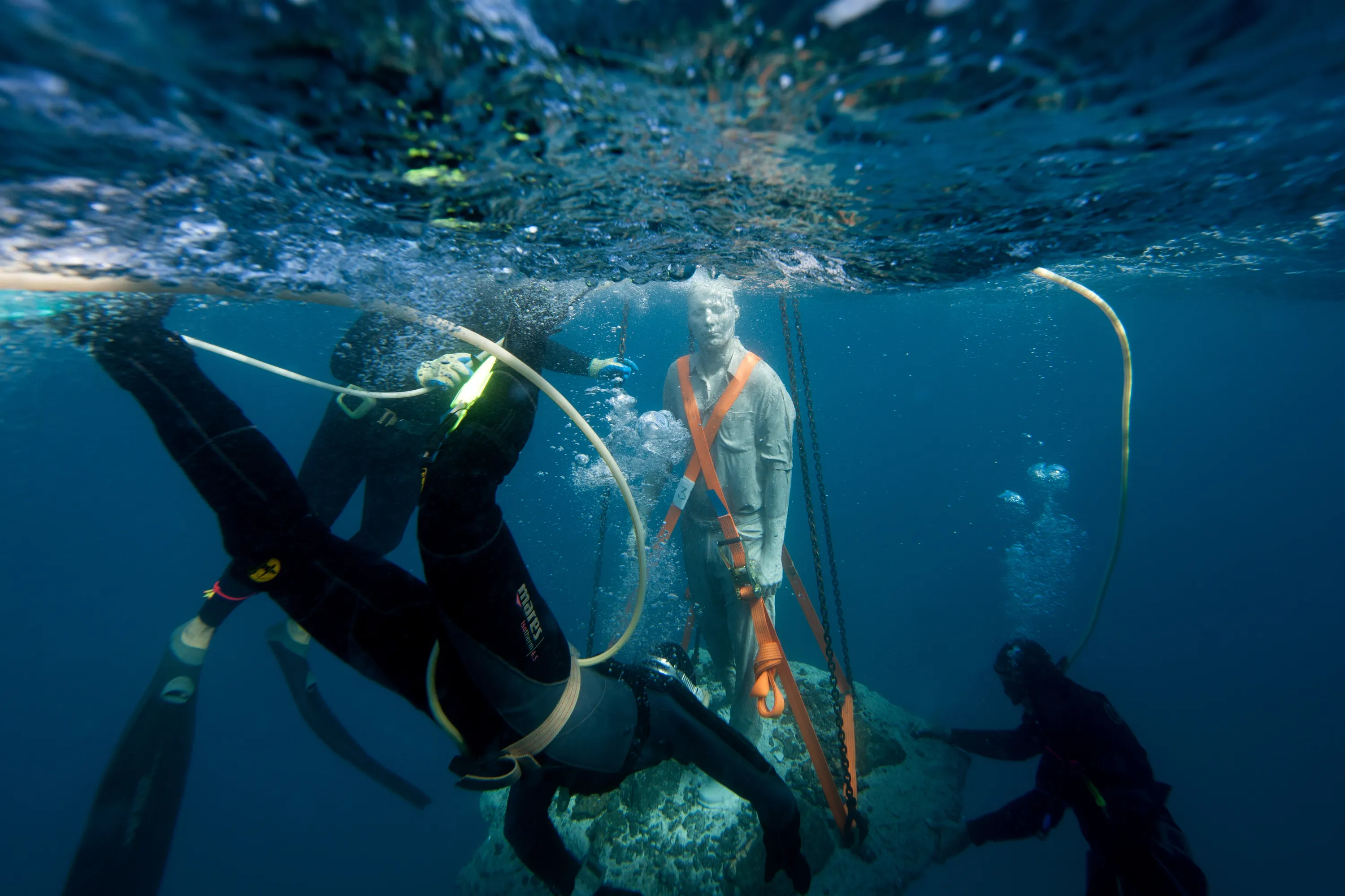 Divers ensure the sculpture makes a safe descent. (Photo by Cat Vinton)