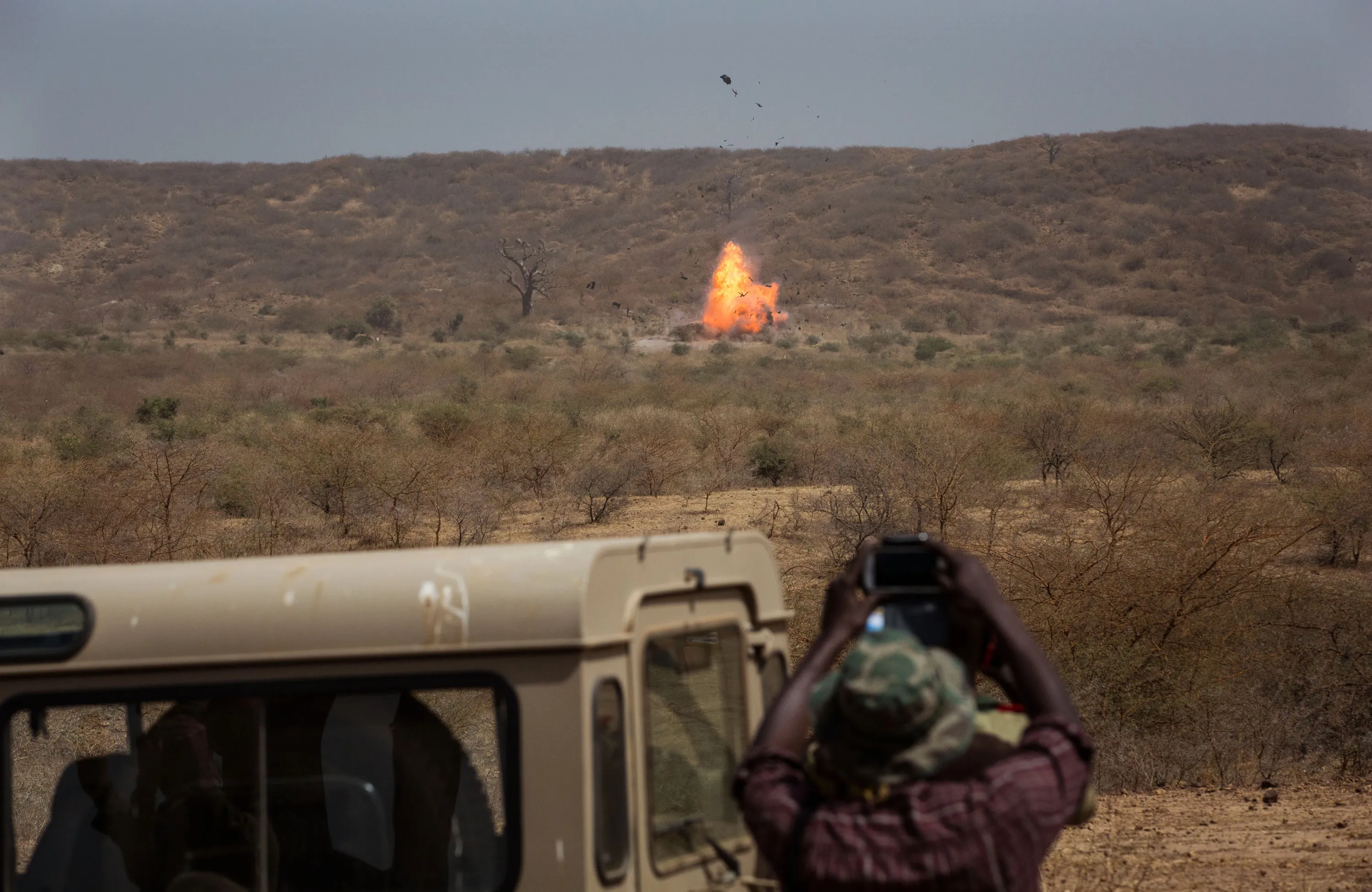 In this photo taken on Thursday, February 18, 2016, a participant, foreground, takes photos as an car explodes during U.S-led Flintlock military training in Thies, Senegal. The training for 50 Senegalese police, gendarmes, customs and judicial officials is part of the annual U.S.-led Flintlock exercises, a more than decade-old effort to help Africans counter threats from extremist militants. Held in Senegal and Mauritania, this year is the first time they are involving law enforcement in such training designed to improve intelligence-gathering and cross-border communication as well as bridge gaps between military and first responders. More than 1,700 military and law enforcement personnel from about 30 countries are participating in the month-long exercise. (Photo by Vincent Tremeau/AP Photo)