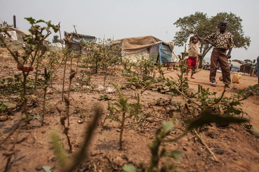 A dying vegetable garden outside the tent of Marie Valentine in M'Poko Internally Displaces Persons Camp in Bangui, Central African Republic on Tuesday, February 16, 2016. Due to the lack of food aid into the camp, many IDPs have grown their own food in private gardens to survive. But due to the lack of rain in recent months, many gardens are failing leaving the IDPs desperate for food once again. (Photo by Jane Hahn/The Washington Post)