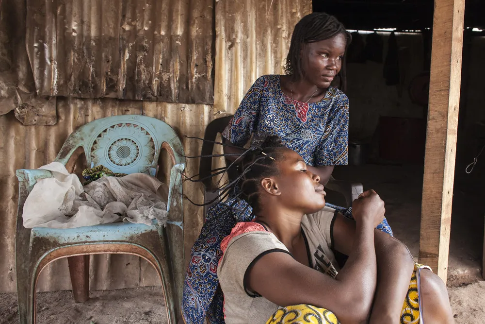 Lydie Ouilibozoumna, 25, braids the hair of Sibel Malipoukayade, 23, in M'Poko Internally Displaced Persons Camp in Bangui, Central African Republic on Saturday, February 13, 2016. Lydie and Sibel both come from PK5 in Bangui and have been living in M'Poko for two years. (Photo by Jane Hahn/The Washington Post)