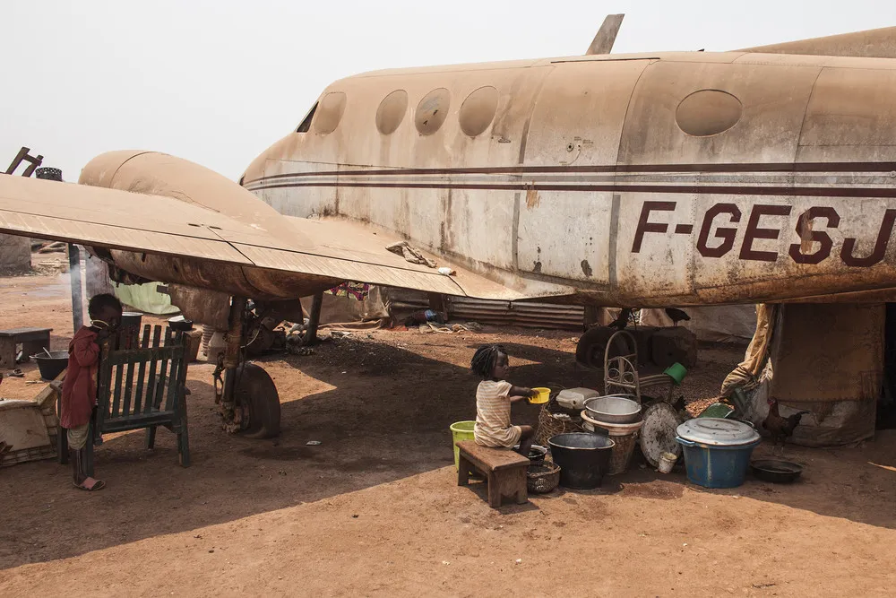 A girl washes dishes next to the wing of a plane wreckage being used as housing in M'Poko Internally Displaced Persons camp in Bangui, Central African Republic on Saturday, February 13, 2016. (Photo by Jane Hahn/The Washington Post)