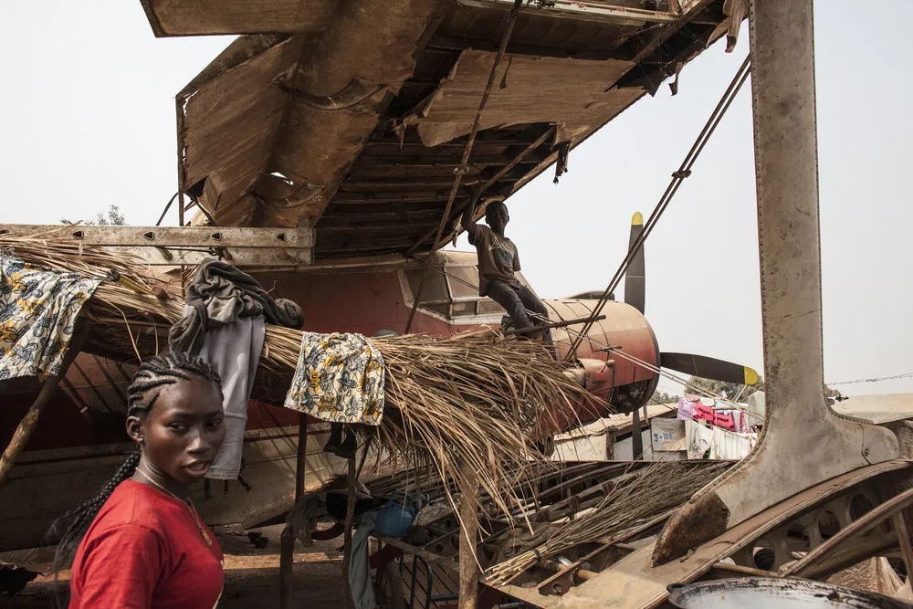 A woman walks under the wing of a plane wreckage being used as housing in M'Poko Internally Displaced Persons camp in Bangui, Central African Republic on Saturday, February 13, 2016. (Photo by Jane Hahn/The Washington Post)