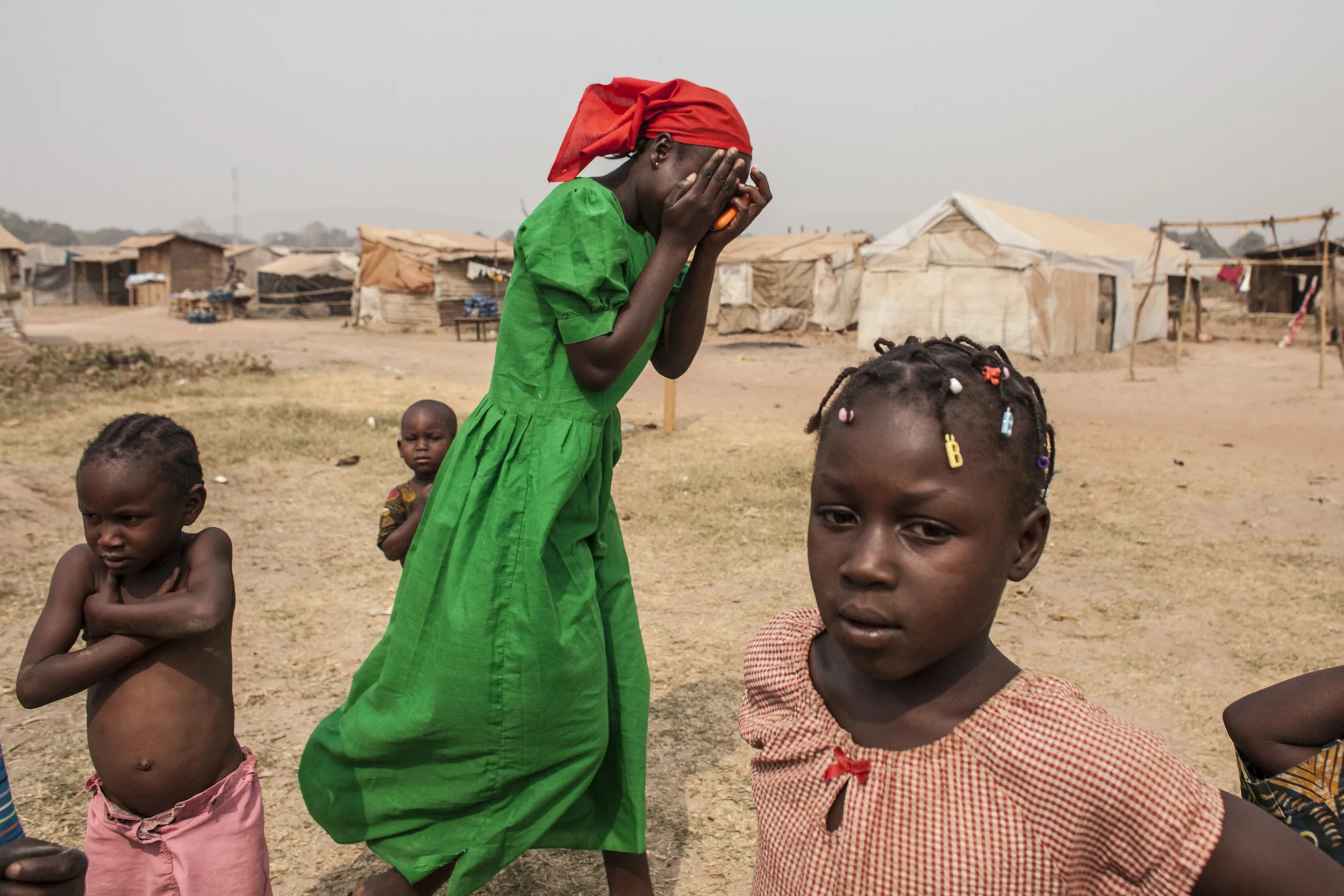 A young girl covers her face in laughter outside a church in the M'Poko Internally Displaced Persons camp in Bangui, Central African Republic on Saturday, February 13, 2016. (Photo by Jane Hahn/The Washington Post)