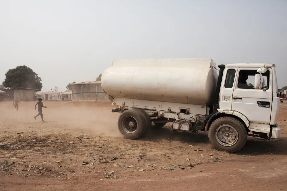 Two boys run after a truck delivering water to the M'Poko Internally Displaced Persons camp in Bangui, Central African Republic on Saturday, February 13, 2016. (Photo by Jane Hahn/The Washington Post)
