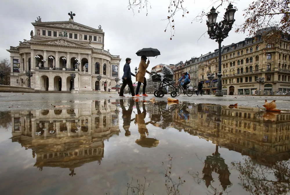 A woman under an umbrella passes by the Old Opera that is reflected in a puddle on a rainy day in Frankfurt, Germany, Wednesday, January 13, 2016. (Photo by Michael Probst/AP Photo)