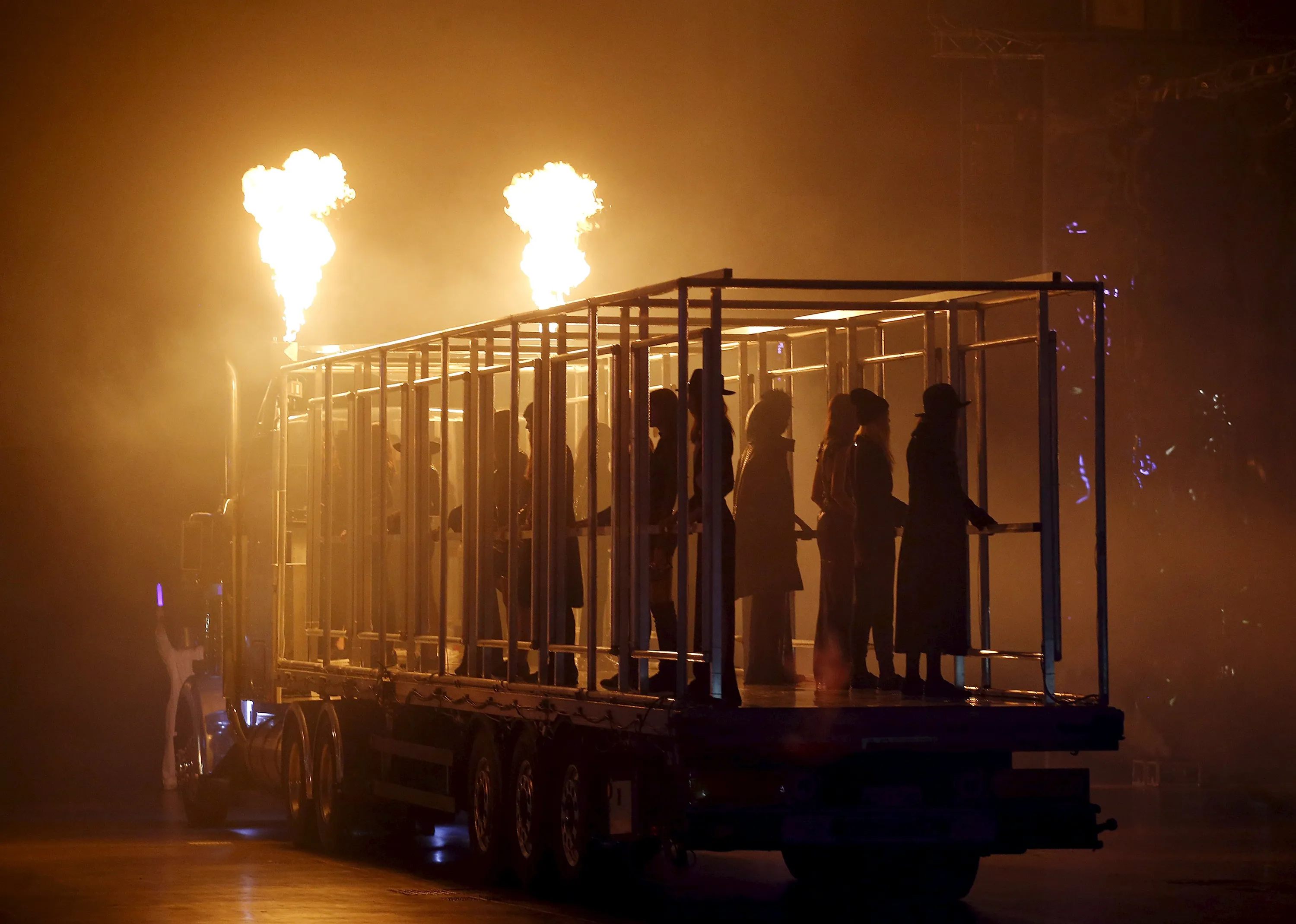 Models arrive on the catwalk on a truck to present creations of of the Philipp Plein Autumn/Winter 2016 woman collection during Milan Fashion Week, Italy, February 27, 2016. (Photo by Alessandro Garofalo/Reuters)