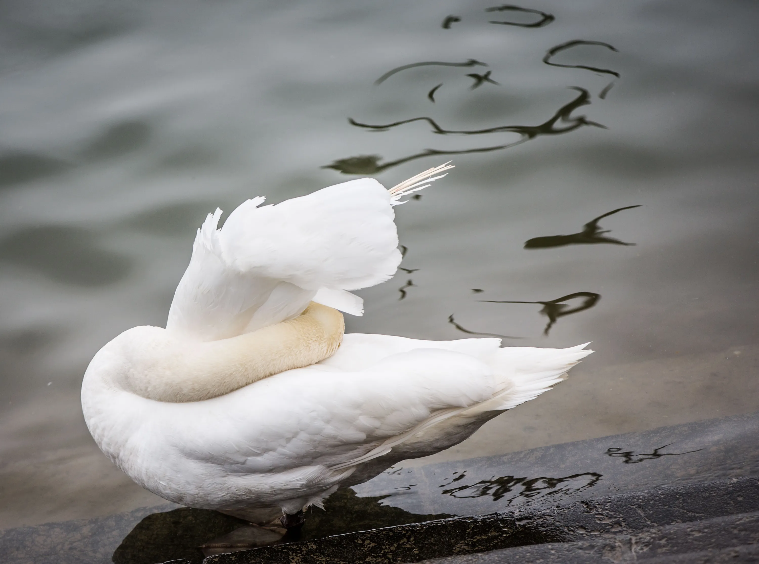 A swan sticks its head under its feathers on the banks of the river Rhine in�Mainz, Germany, Wednesday, March 2 2016. (Photo by Frank Rumpenhorst/DPA via AP Photo)