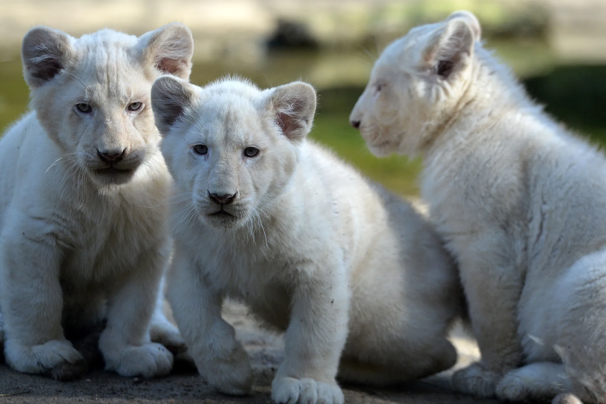 Three white lion cubs, three-months old, play at the zoo in La Fleche, northwestern France, on march 8, 2016. (Photo by Jean-Francois Monier/AFP Photo)