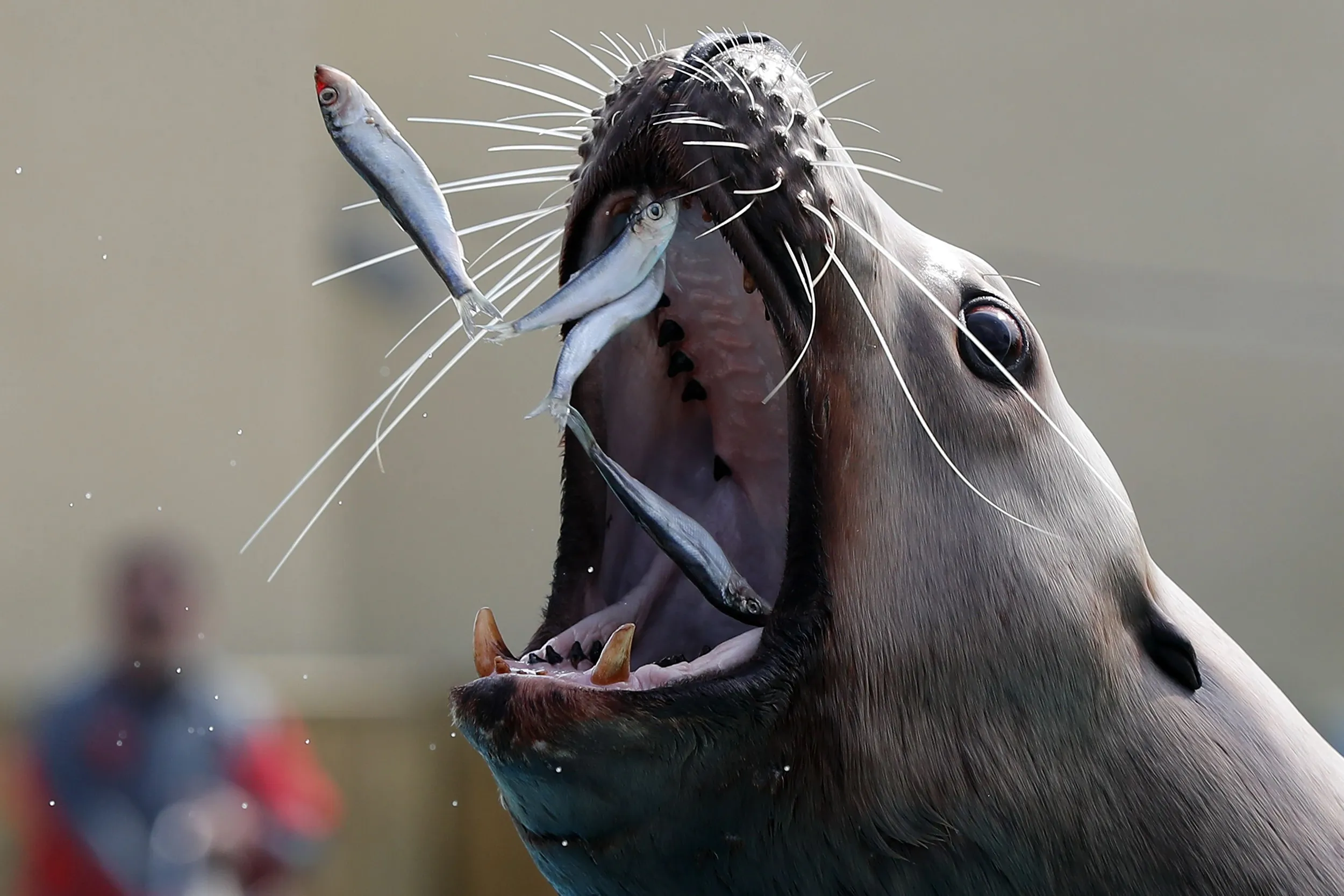 A sea lion eats sardines in the Marineland theme park on the French riviera city of Antibes, southeastern France, on March 17, 2015. (Photo by Valery Hache/AFP Photo)