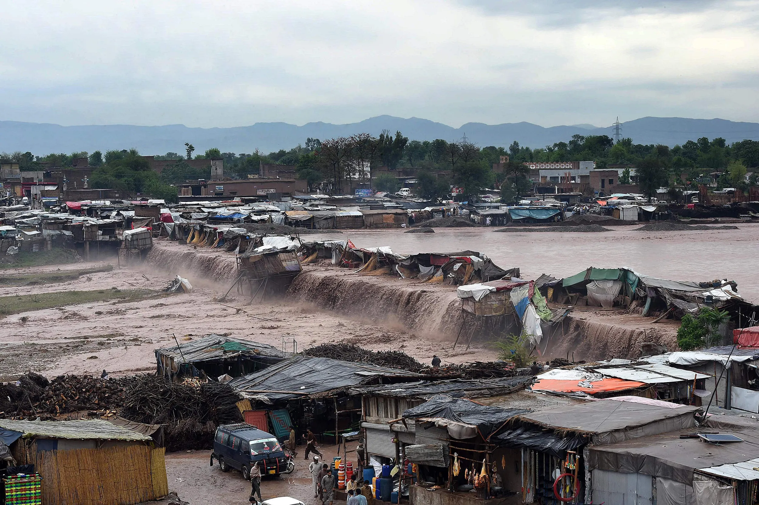 Flood waters rush through a Pakistani market area as vendors and resident scramble to save their possessions on the outskirts of Peshawar on April 3, 2016. Heavy rains have killed at least 121 people, injured 124 and damaged 852 houses since March 9 across Pakistan, according to the National Disaster Management Authority. It said landslides and collapsed roofs caused most of the fatalities. (Photo by A. Majeed/AFP Photo)