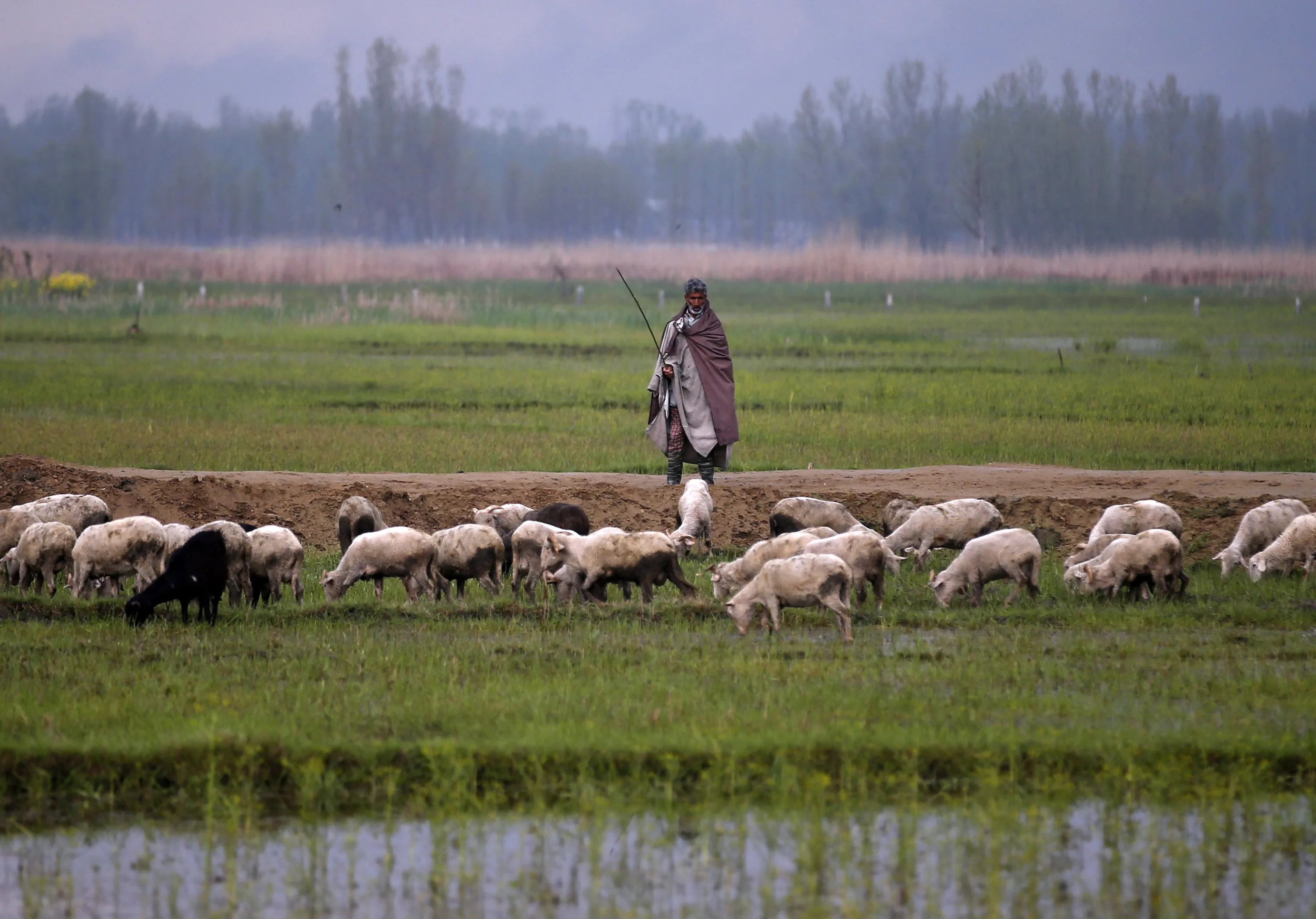 A Kashmiri farmer watches his sheep as they pasture beside a flooded paddy field in Srinagar, India, April 4, 2016. (Photo by Danish Ismail/Reuters)