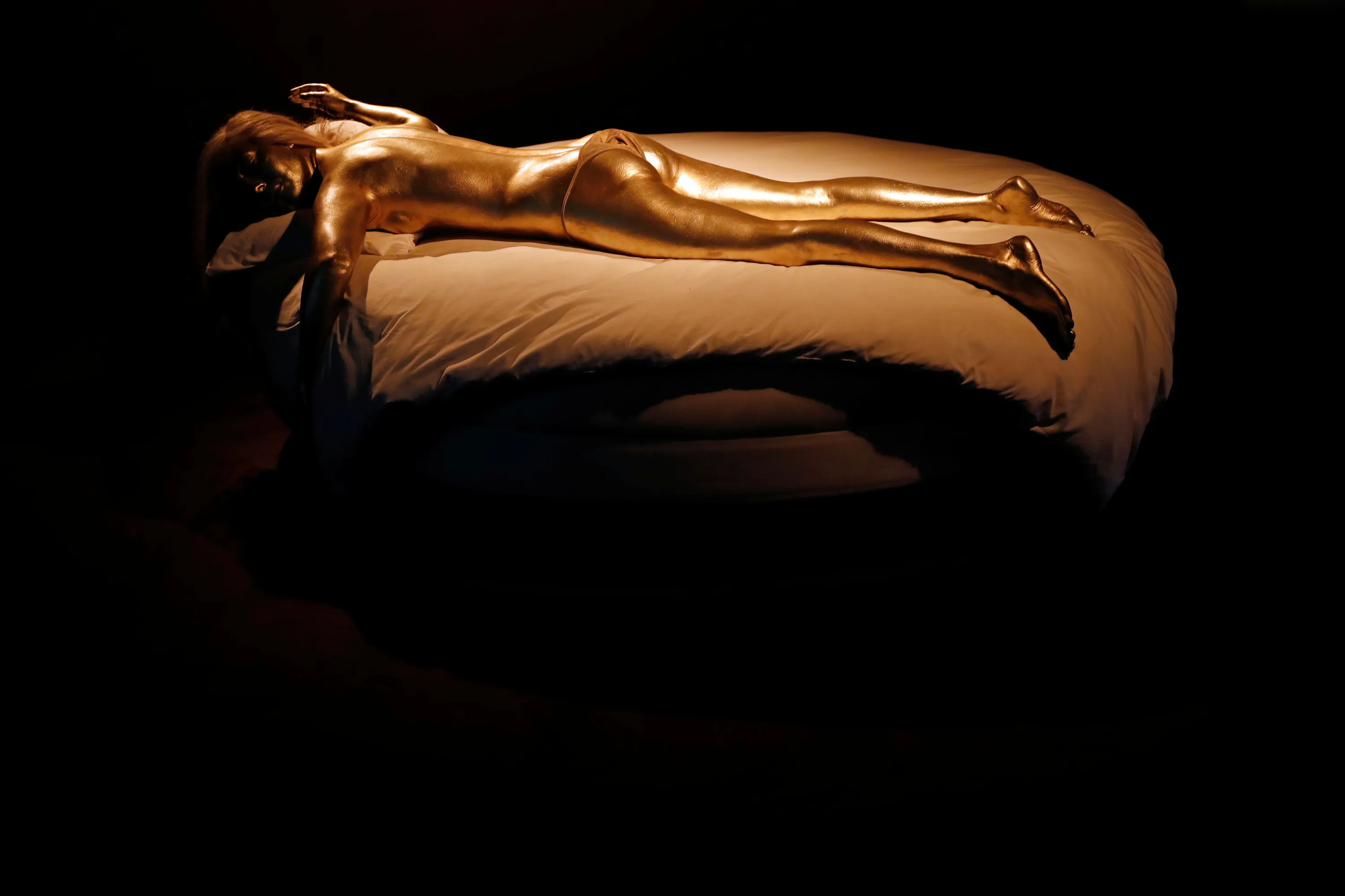 A mannequin of the woman painted gold in the James Bond film “Goldfinger” is displayed during a press presentation of the exhibition “The Designing 007: Fifty Years of Bond Style” at the Grande Halle de la Villette in Paris, France, April 13, 2016. (Photo by Benoit Tessier/Reuters)