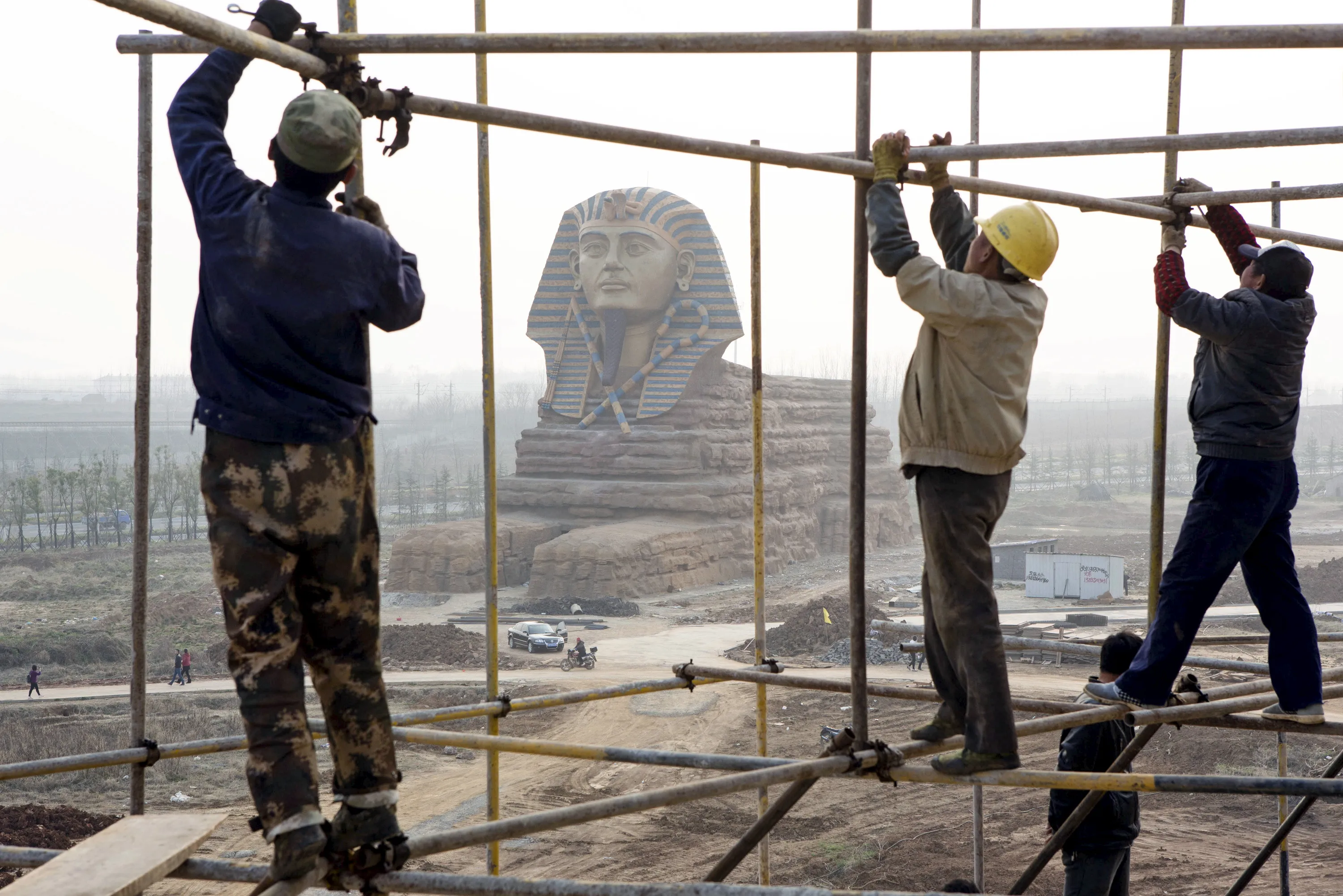 Laborers work on scaffolding near a full-scale replica of the Sphinx at an unfinished movie and animation tourism theme park, in Chuzhou, Anhui province, March 27, 2015. (Photo by Reuters/China Daily)