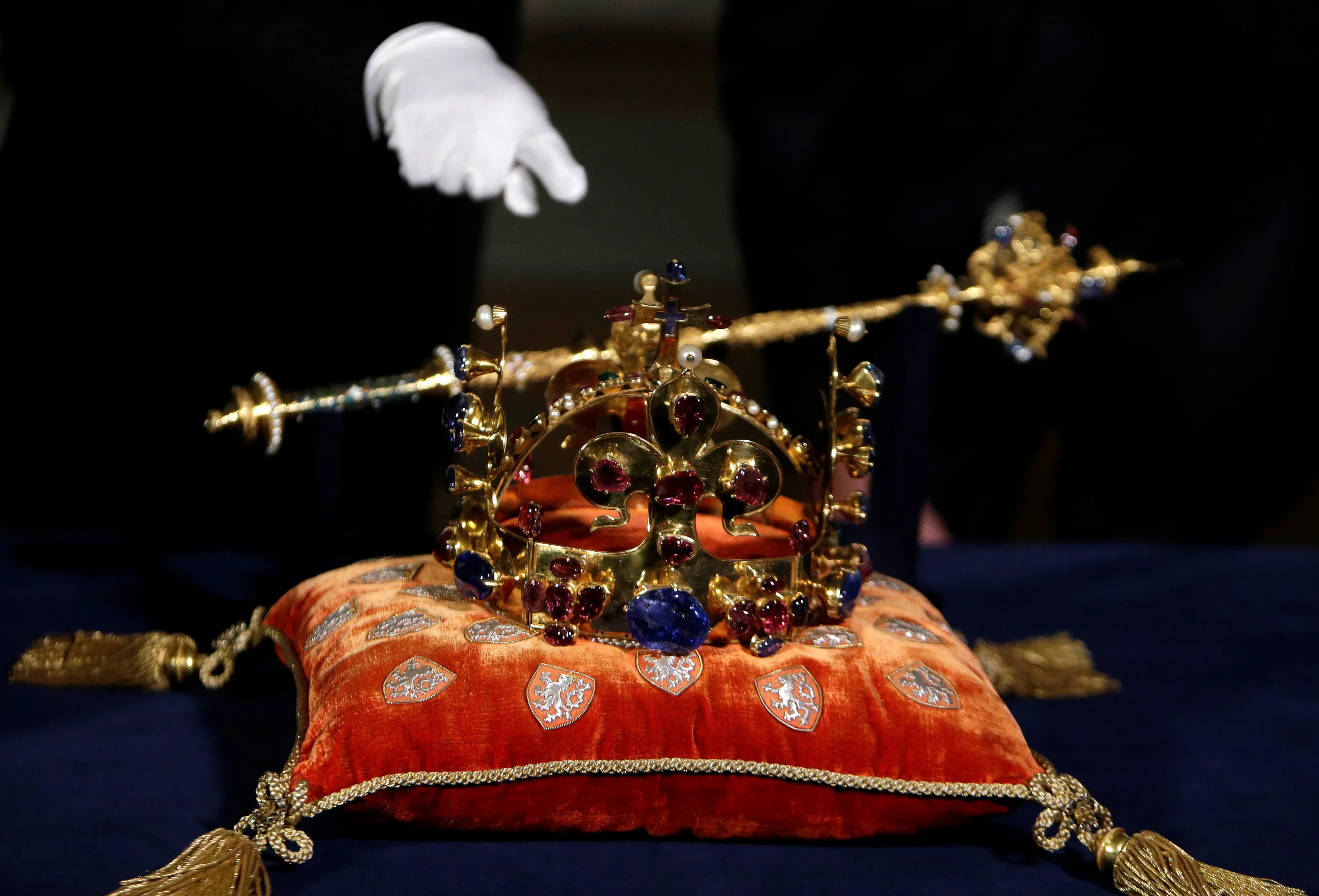 A Prague Castle curator points at the Bohemian Crown Jewels as they rest on a cushion at St. Vitus cathedral, marking the 700th anniversary of King Charles IV's birth in Prague, Czech Republic, May 12 2016. (Photo by David W. Cerny/Reuters)