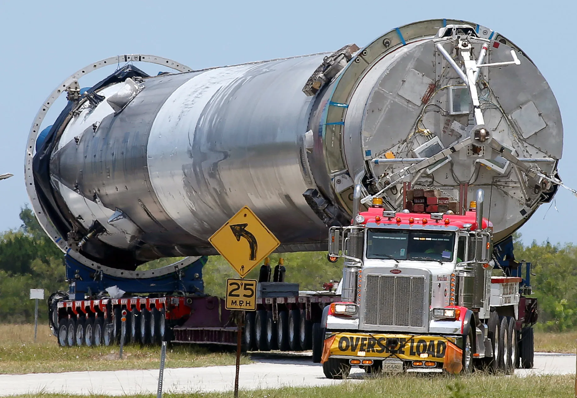 The recovered first stage of a SpaceX Falcon 9 rocket is transported to the SpaceX hangar at launch pad 39A at the Kennedy Space Center in Cape Canaveral, Florida May 14, 2016. The vehicle was launched on May 6 and returned to land a short time later aboard a barge in the Atlantic Ocean. (Photo by Joe Skipper/Reuters)