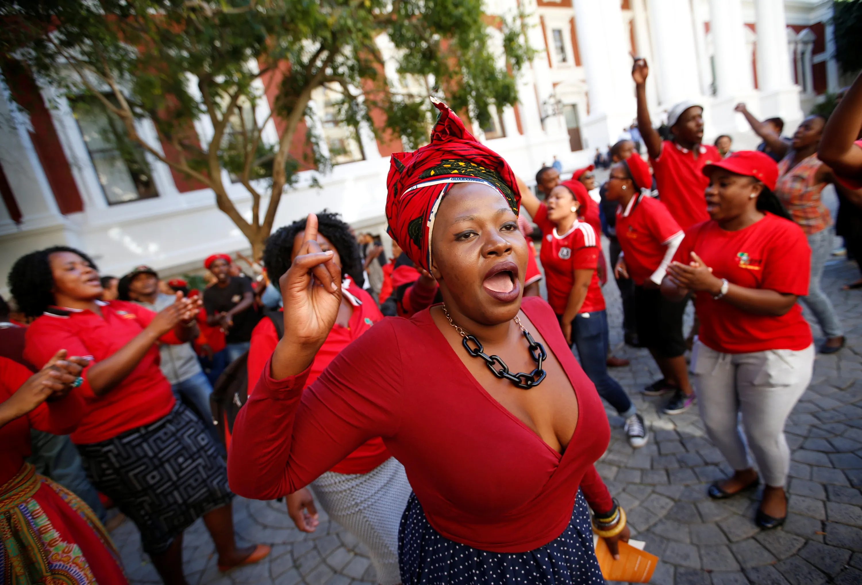 Members of Julius Malema's Economic Freedom Fighters (EFF) party sing after they were evicted from Parliament during President Jacob Zuma's question and answer session in Cape Town, South Africa, May 17, 2016. (Photo by Mike Hutchings/Reuters)