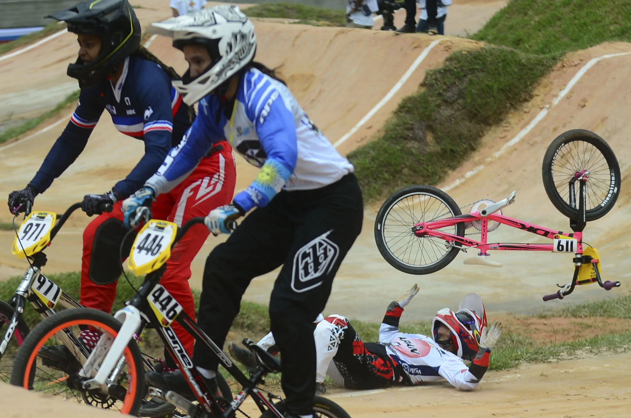 Cyclists compete during the UCI BMX World Championships Elite Women's Moto Race on May 29, 2016 in Medellin, Antioquia department, Colombia. (Photo by Raul Arboleda/AFP Photo)