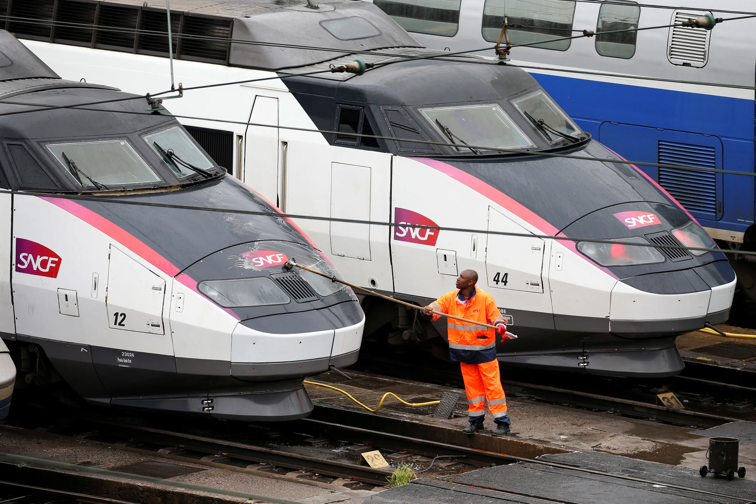 A worker cleans up a French TGV train (high speed train) parked at a SNCF depot station in Charenton-le-Pont near Paris, France, May 31, 2016 as railway workers from the France's rail-operator SNCF will start a national railway strike on Tuesday evening. (Photo by Charles Platiau/Reuters)