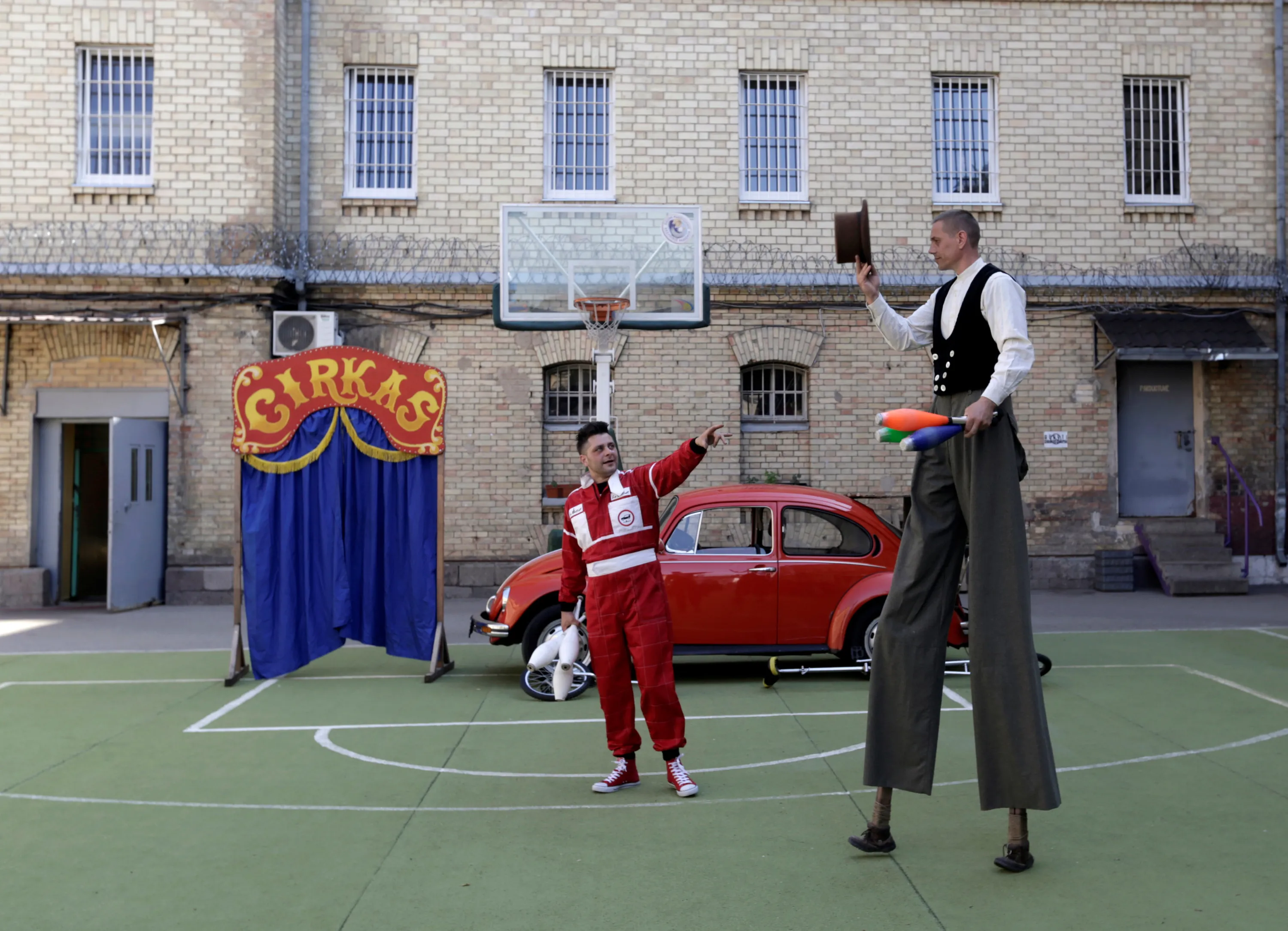 Circus artist Viaceslavas Mickevicius (L) and inmate Darius Braziunas perform during their first circus performance to an audience of visiting relatives in a prison in Vilnius, Lithuania, June 3, 2016. (Photo by Ints Kalnins/Reuters)