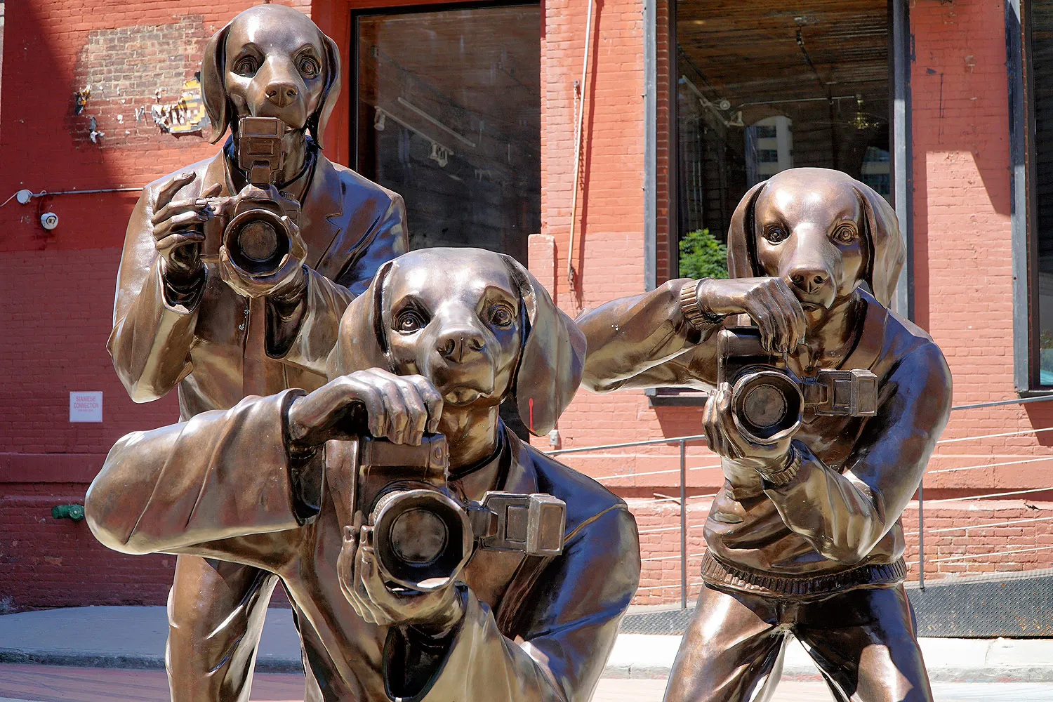 “Paparazzi Dogs” art installation, New York, NY on June 9, 2016. DUMBO in Brooklyn, NY, is home to many A-list celebrities like Anne Hathaway and her husband. So, it is fitting that a husband and wife artist team have created this art installation right in the heart of this celebrity neighborhood. The exhibit has been installed beneath the Manhattan Bridge in the Pearl Street Triangle. With all the upscale stores and restaurants, it is a wonder that there are not more than a handful of NY paparazzi roaming its streets. Celebrities love to hide from the paparazzi when they can. The “Paparazzi Dogs” exhibit is probably the only time a celebrity doesn't mind seeing someone pointing a camera. Gillie and Marc Schattner are Australian contemporary artists who love to create artwork of hybrid characters combining animals with human bodies. One of their favorite characters is called, “Dogman” which is the character for this installation. With “Paparazzi Dogs” the number of celebrity photographers on the prowl has increased by three. But, the celebrities residing in DUMBO don't seem to mind this artistic creation. (Photo by Ken Katz/Startraksphoto.com)