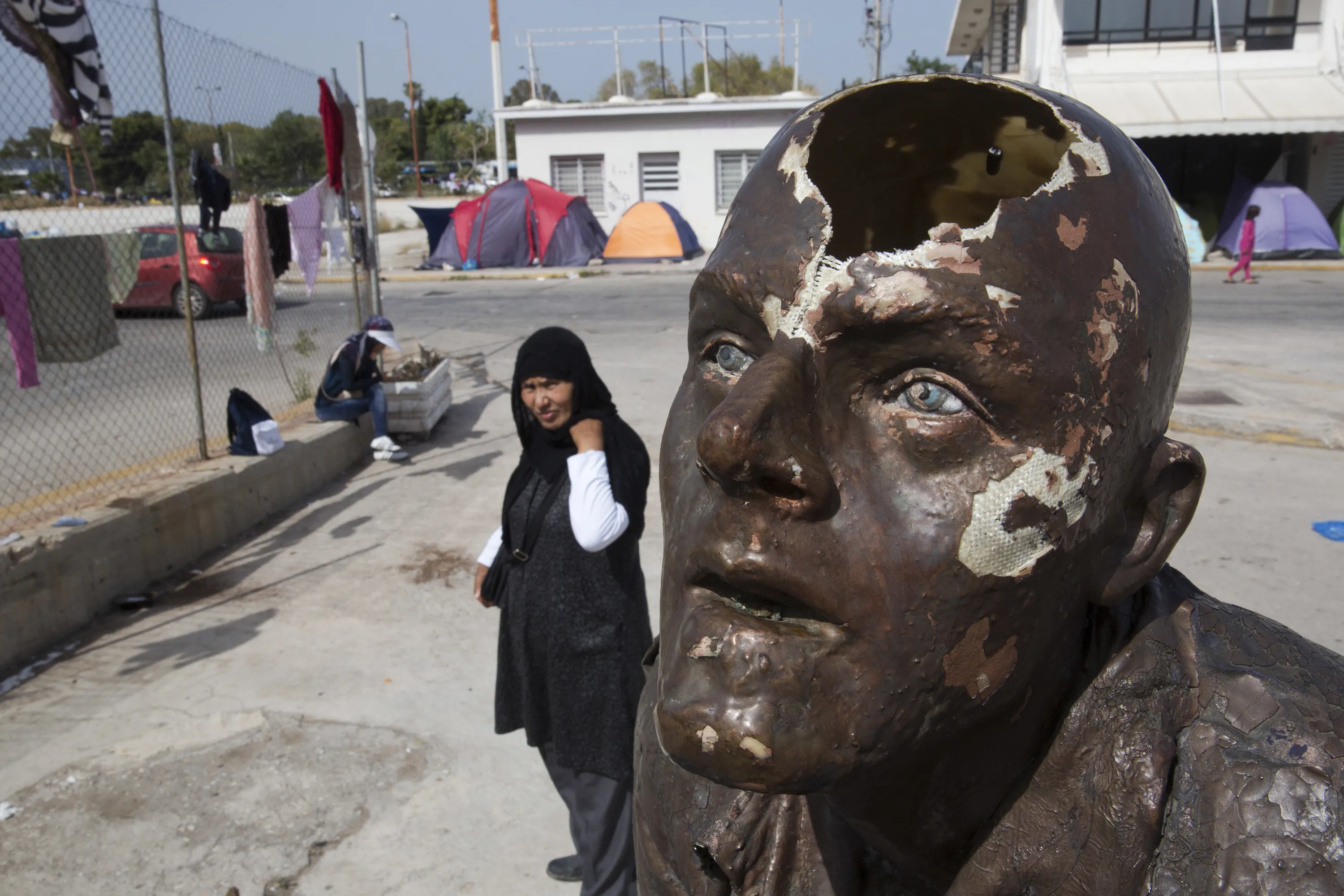 An Afghan woman stands behind the broken head of a statue at the west terminal of an abandoned old airport which is used as a shelter for over 3,500 migrants, in southern Athens, on Monday, May 30 ,2016. The government has been moving migrants from makeshift camps into organized shelters and the Greek government said Monday they will continue to clear the Greek- Macedonian border area over the next few days. (Photo by Petros Giannakouris/AP Photo)